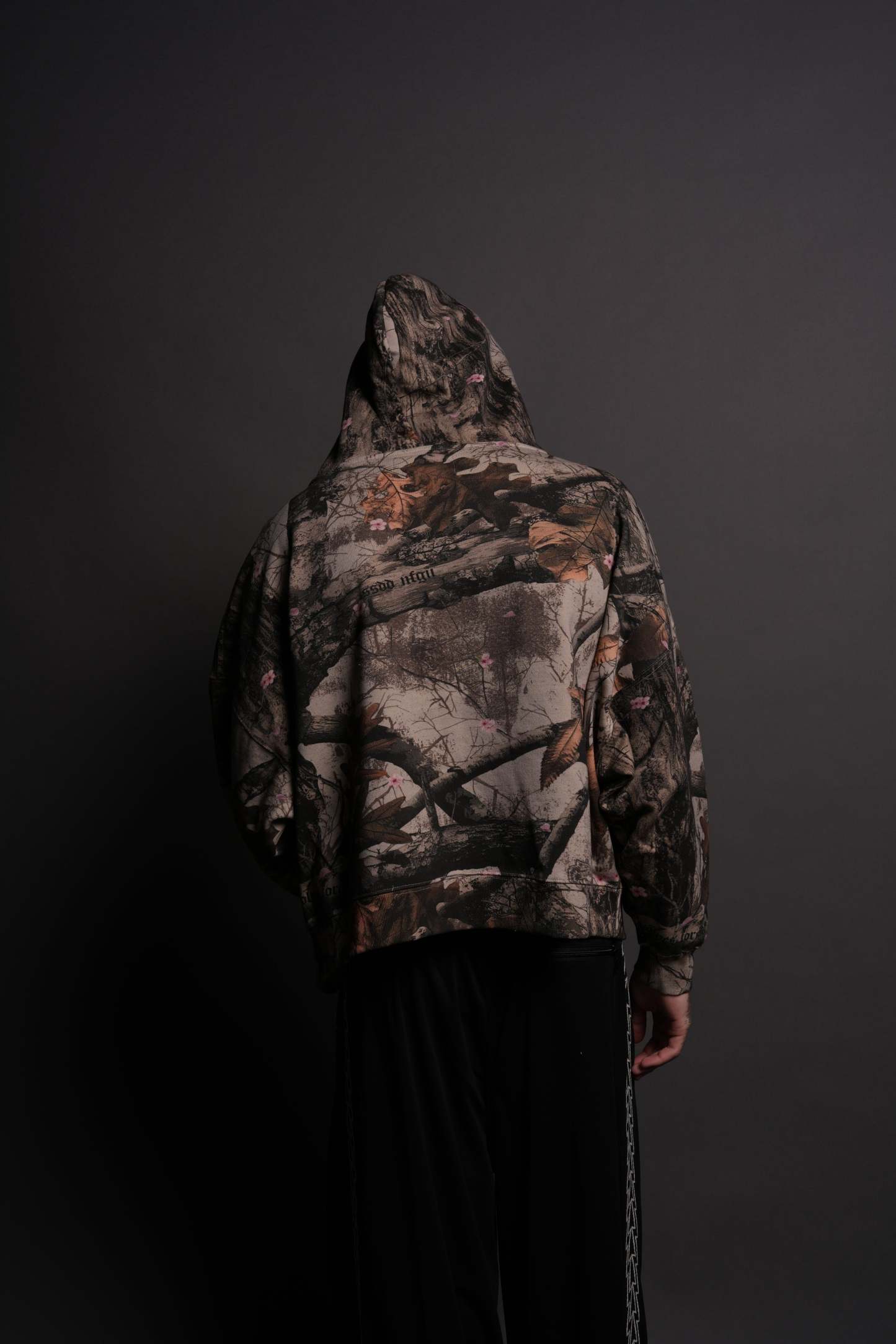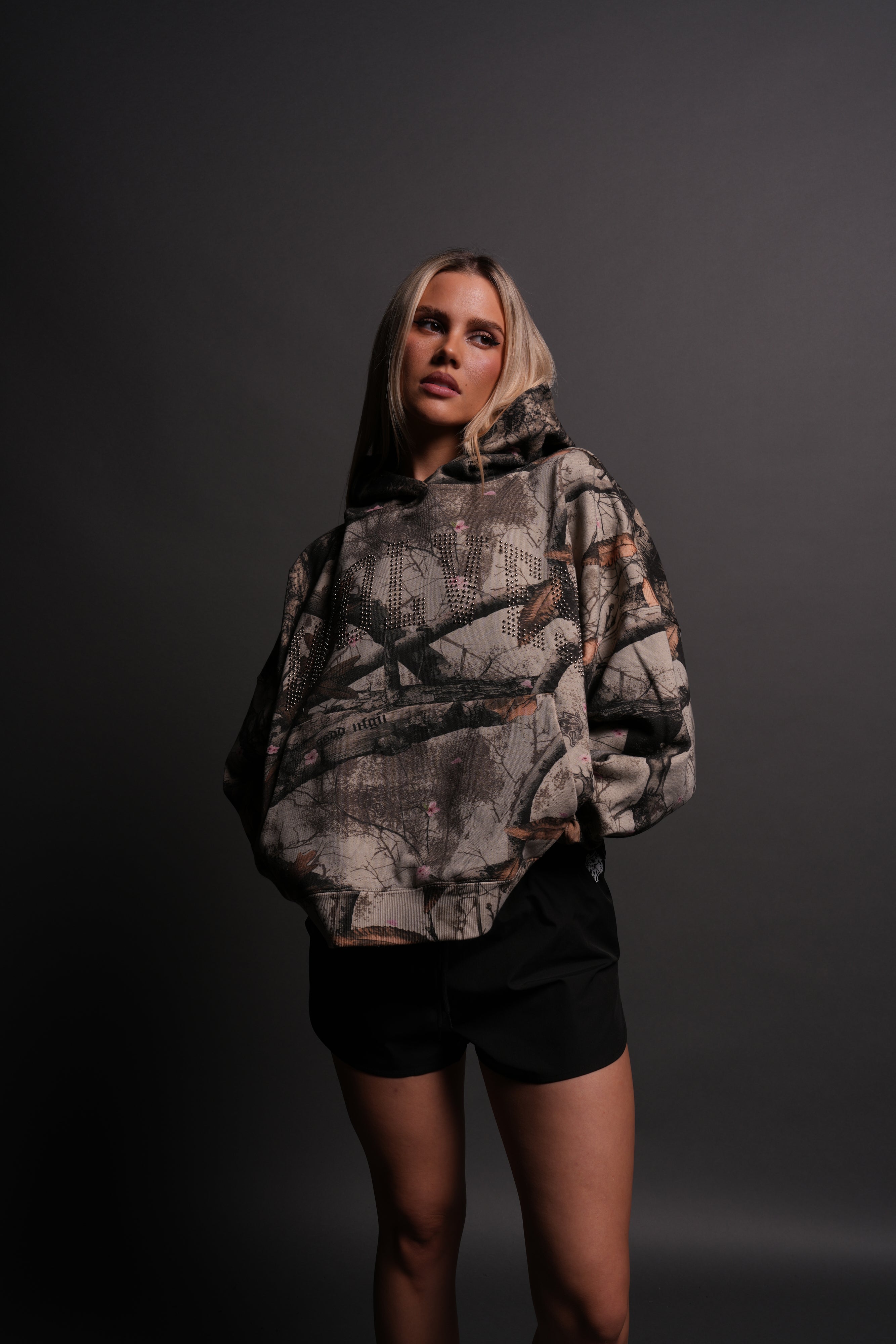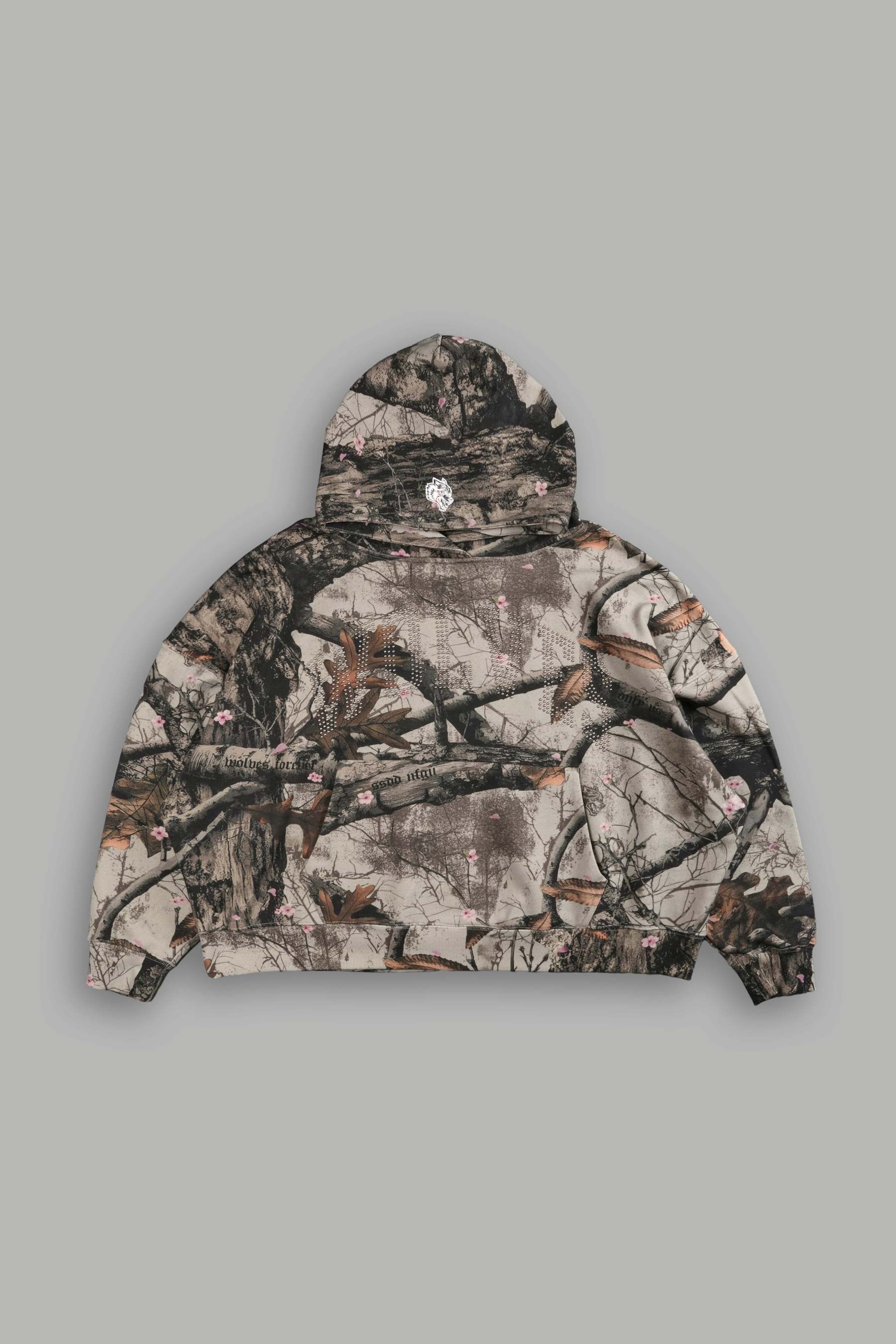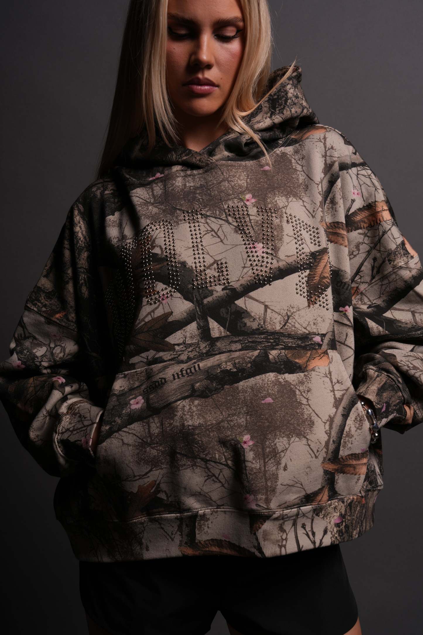 Loyalty Studded Grunge "Gage Box Cut" Hoodie in Cherry Blossom Woodland Camo