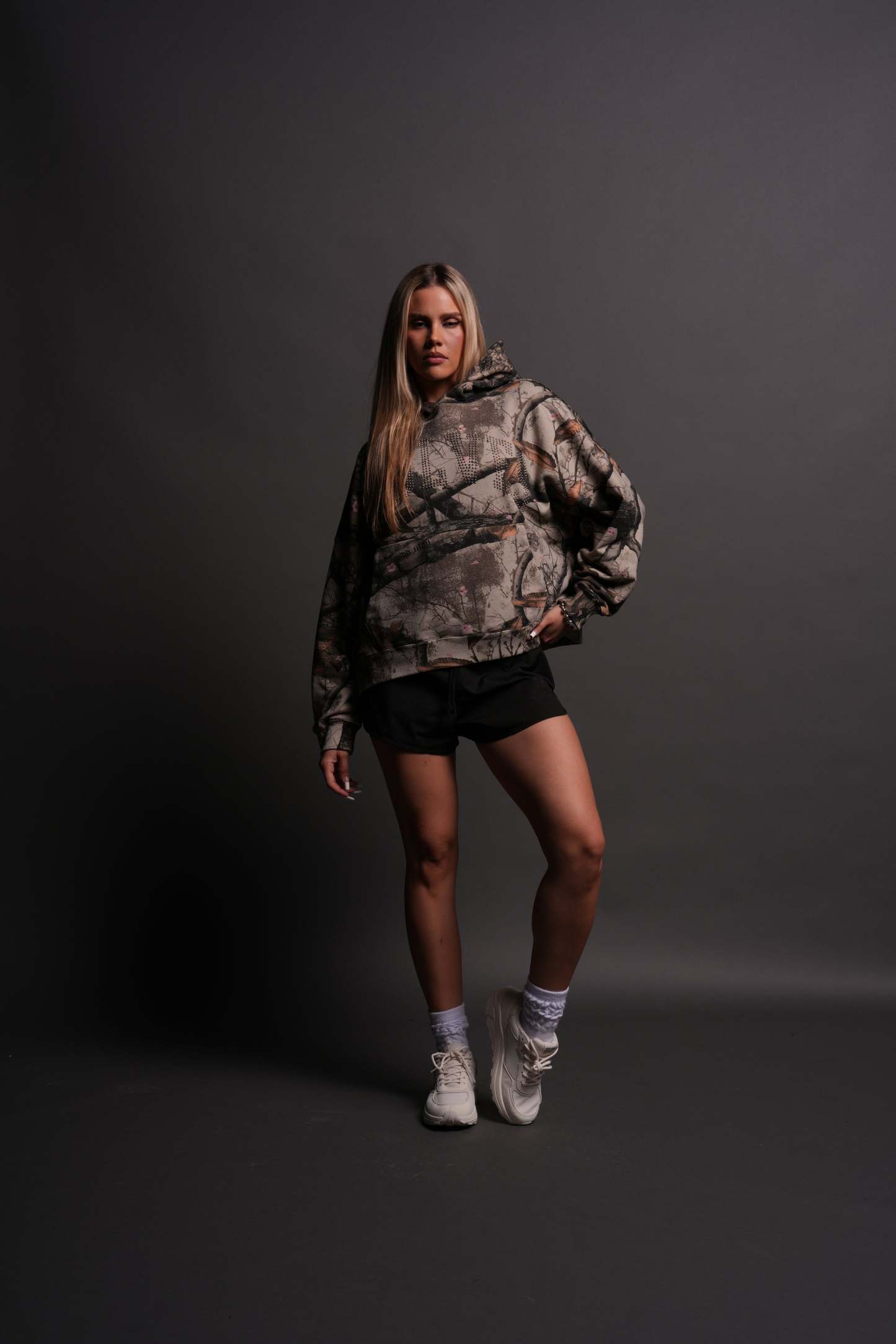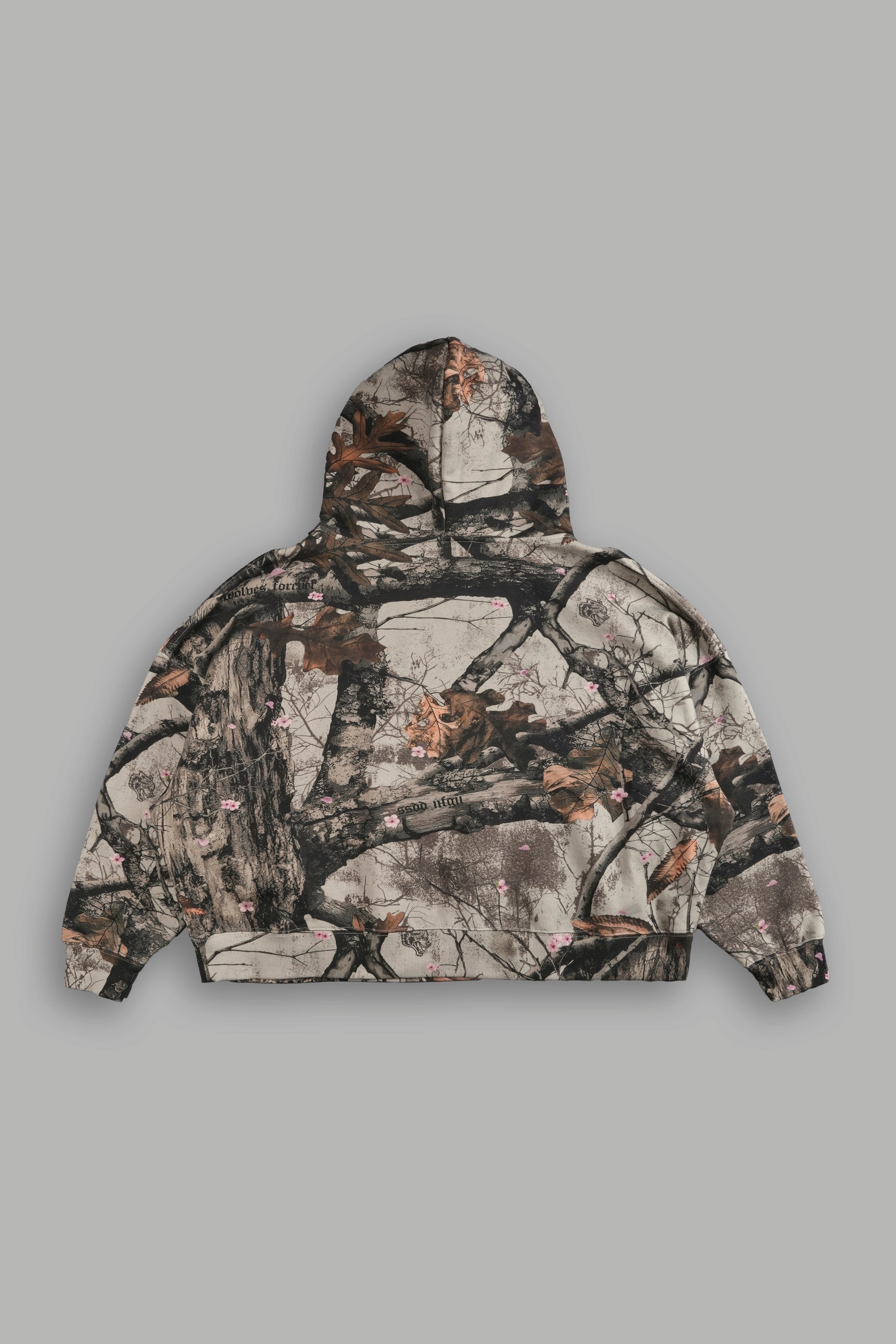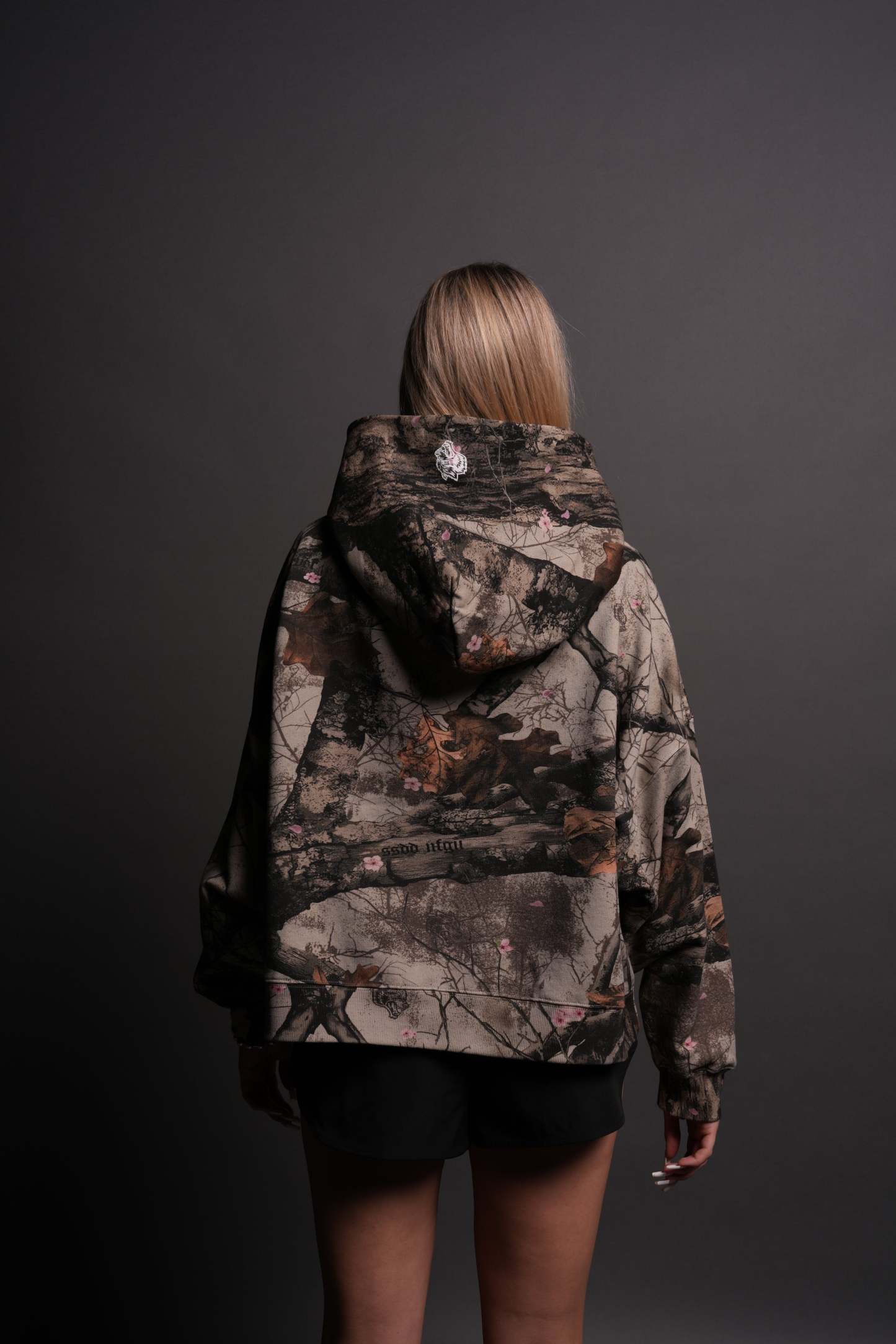 Loyalty Studded Grunge "Gage Box Cut" Hoodie in Cherry Blossom Woodland Camo