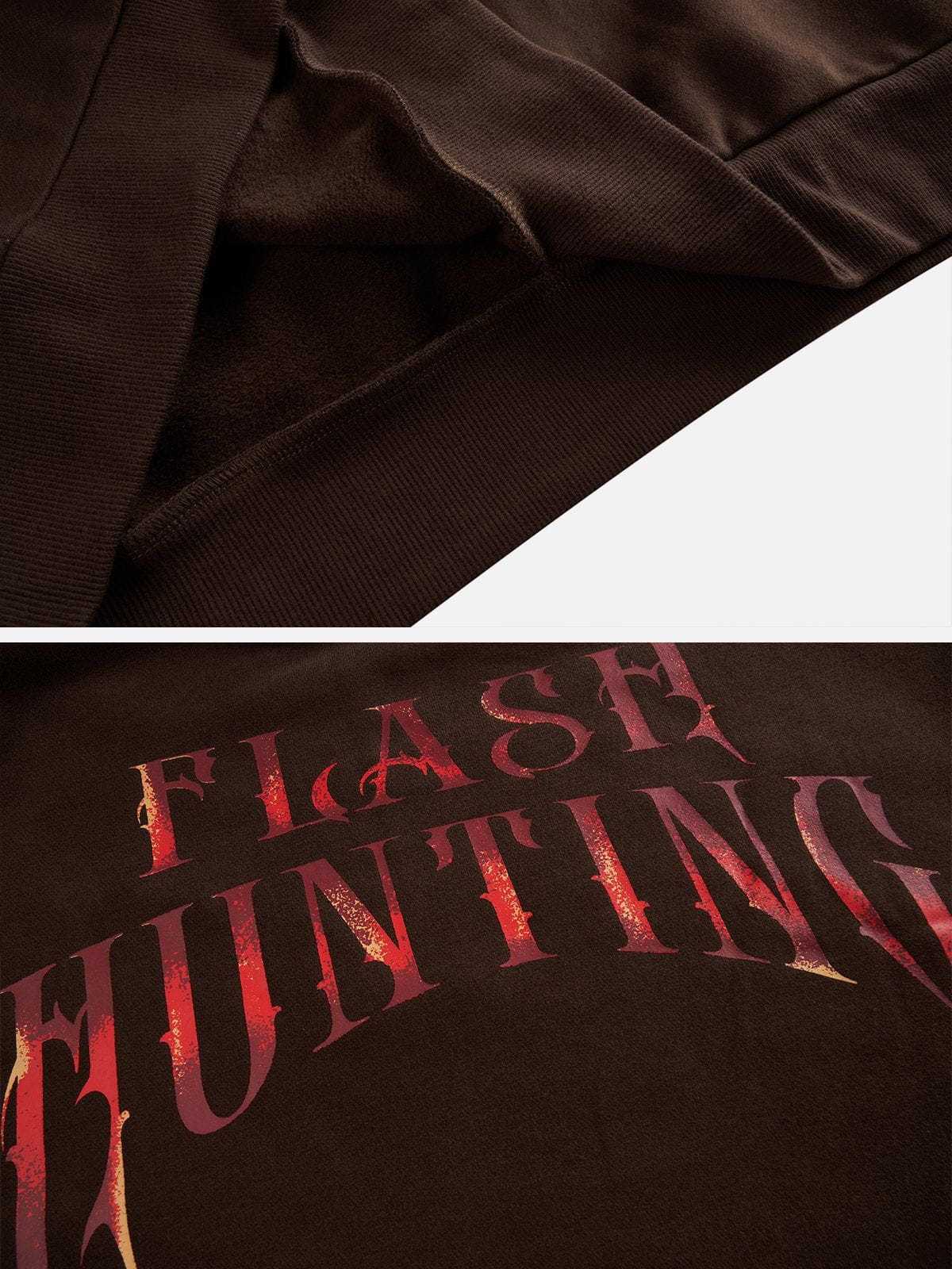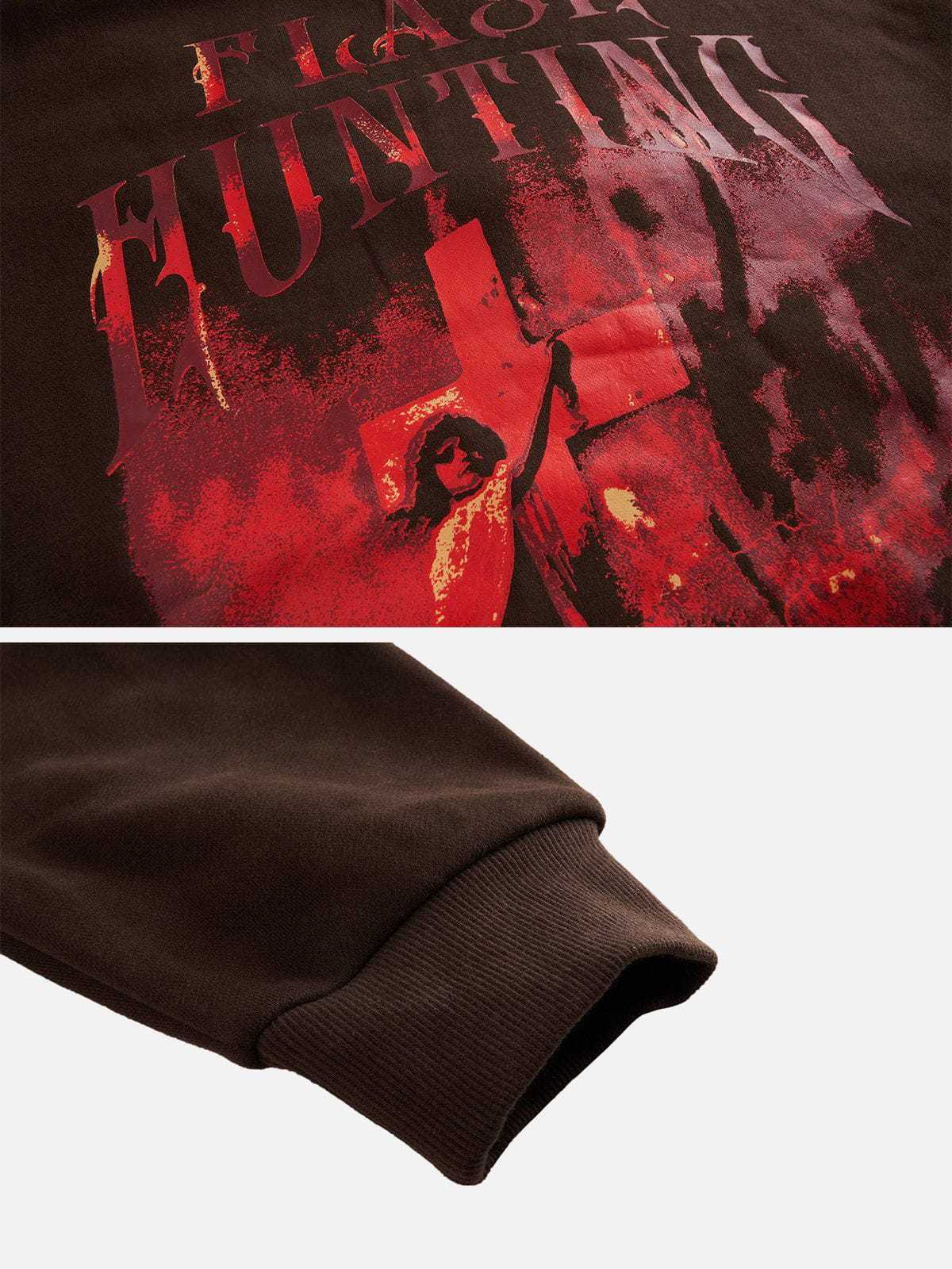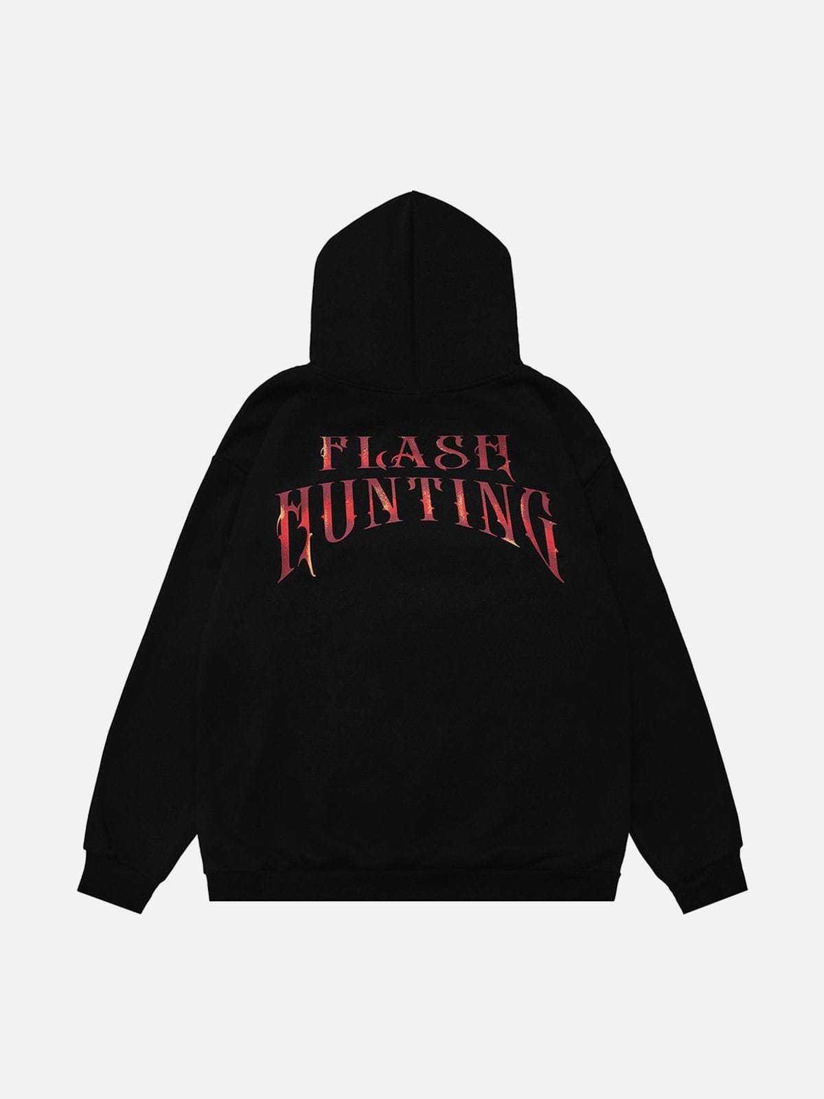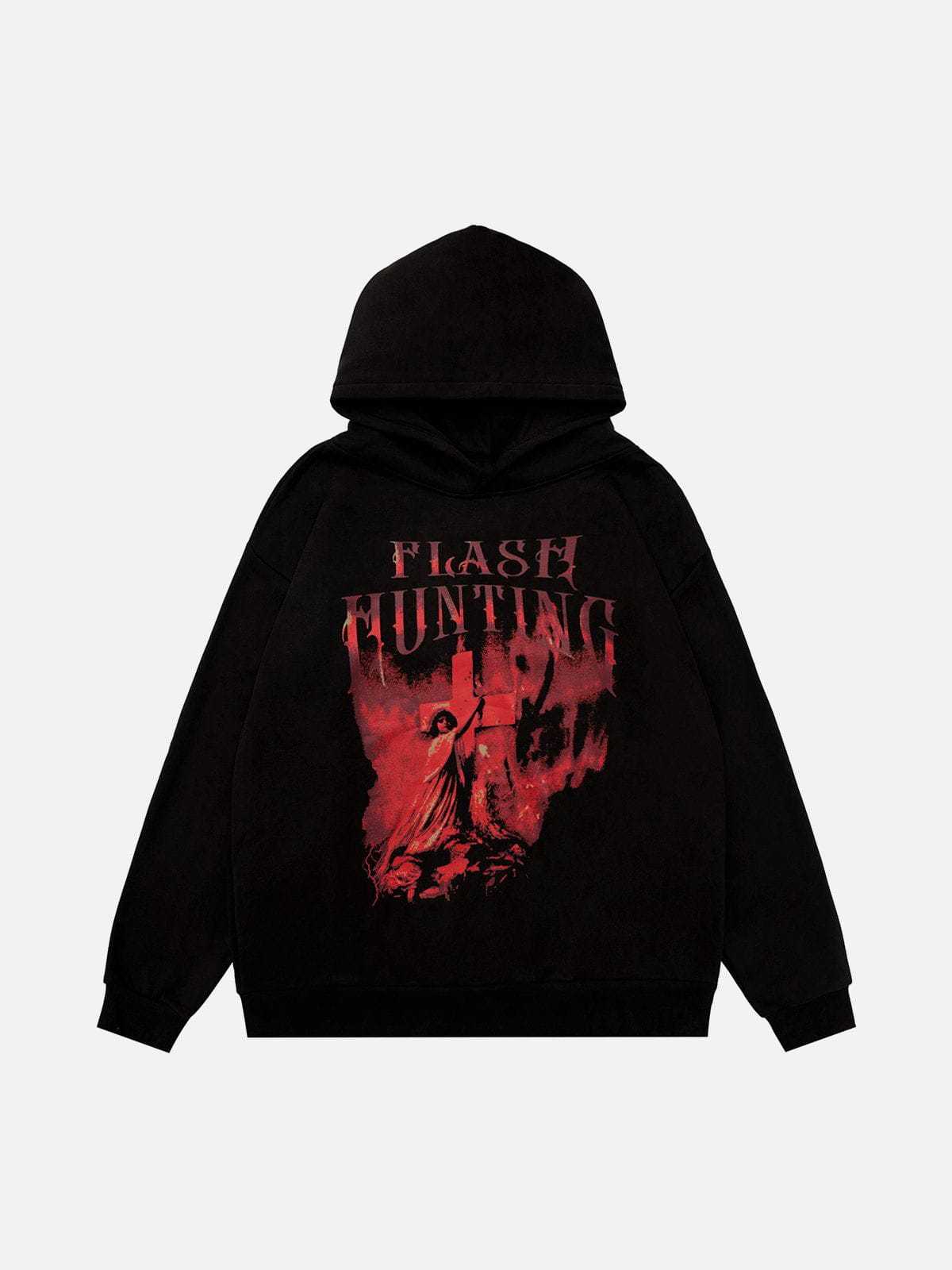 Featuring a striking portrait cross print on the front, accompanied by the bold "Flash Hunting" lettering, which combines edgy style with a touch of mystery. Crafted with cotton for ultimate comfort and breathability.