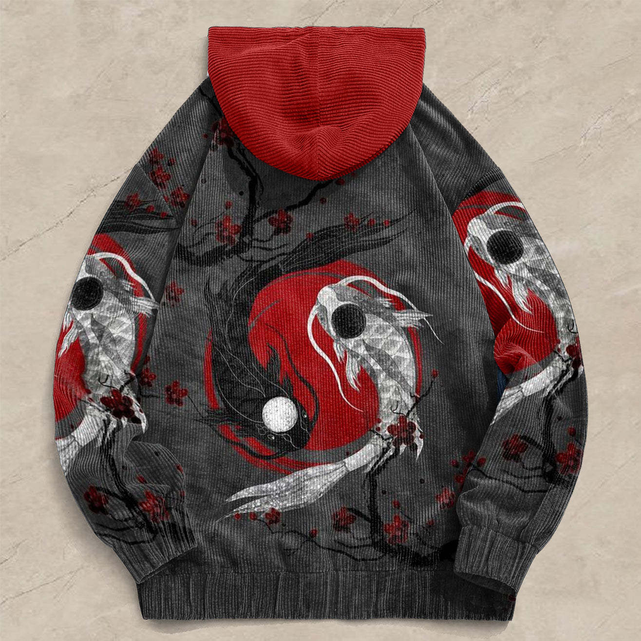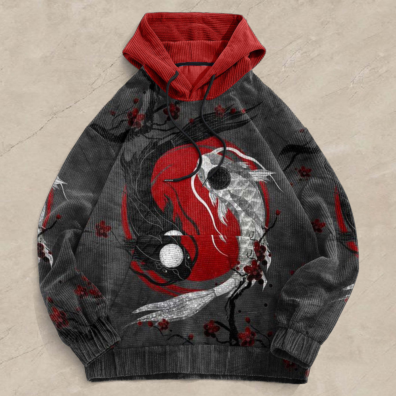 Peace Carp Print Corduroy Contrast Hoodies