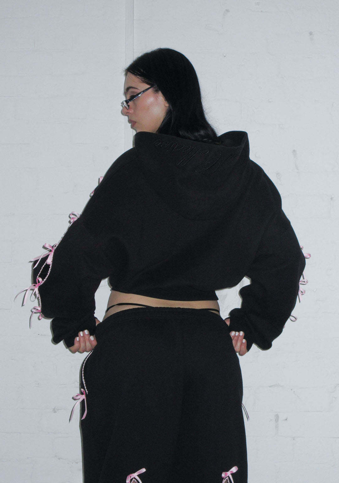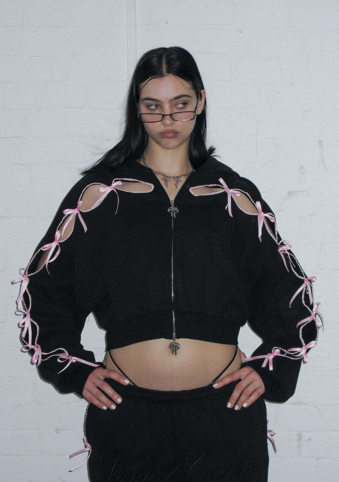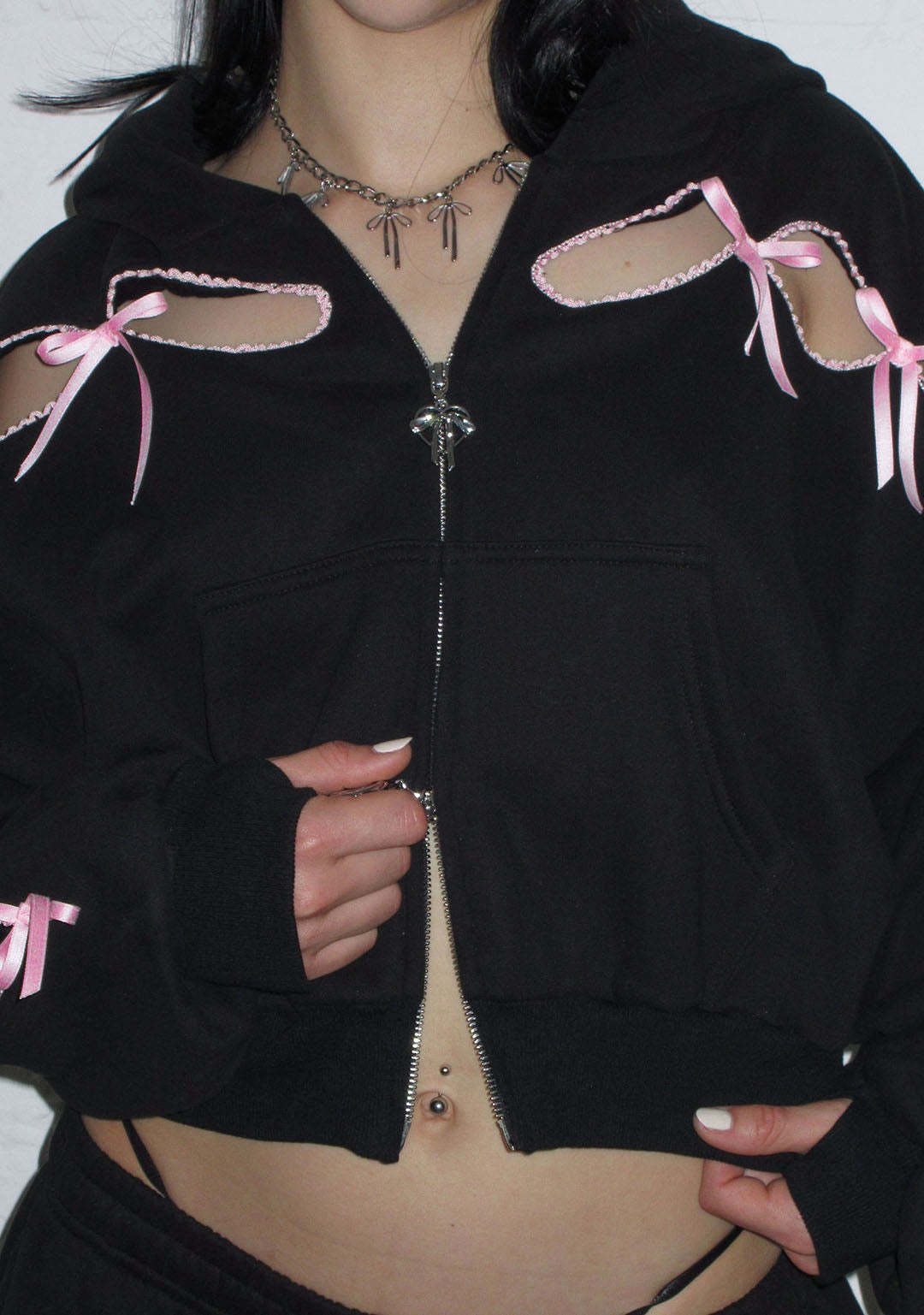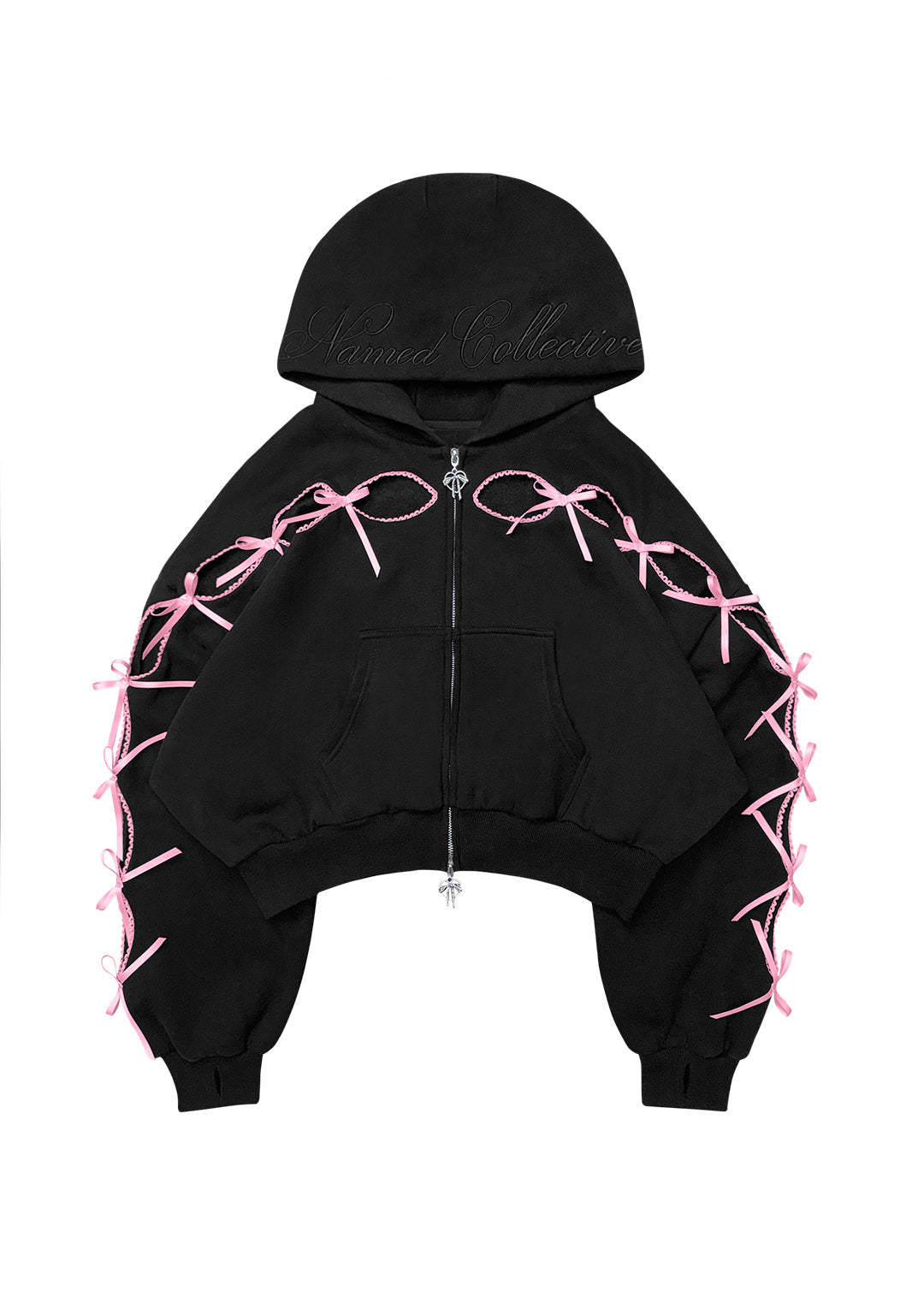 PRINC355 RIBBON CROP ZIP HOODIE BLACK