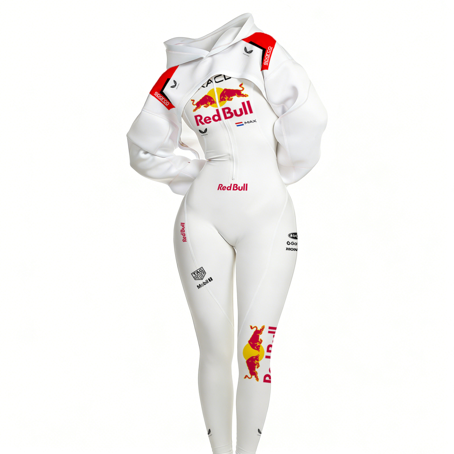 Red Racing-Inspired Hooded One-Piece Suit with Full-Zip Design