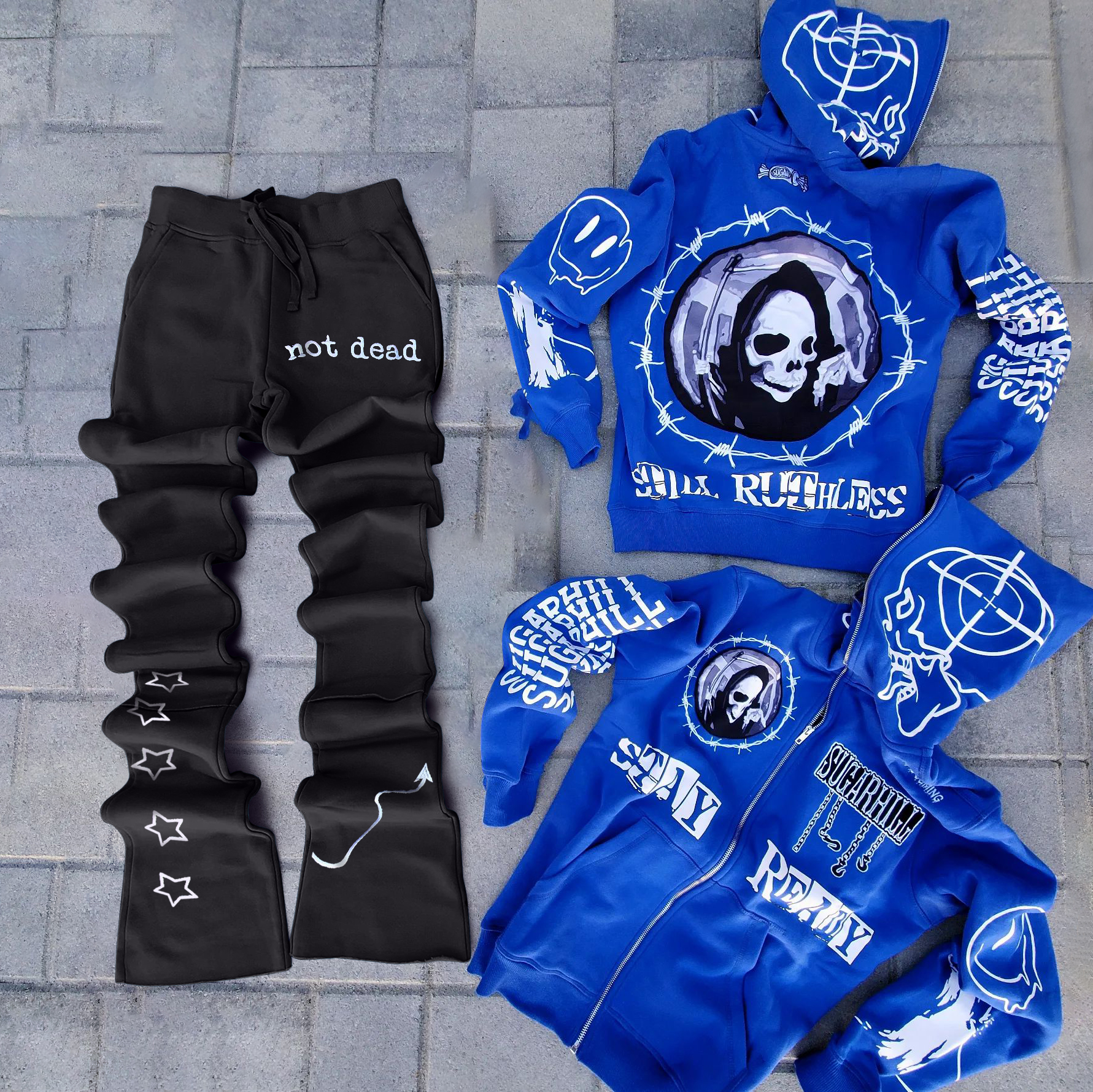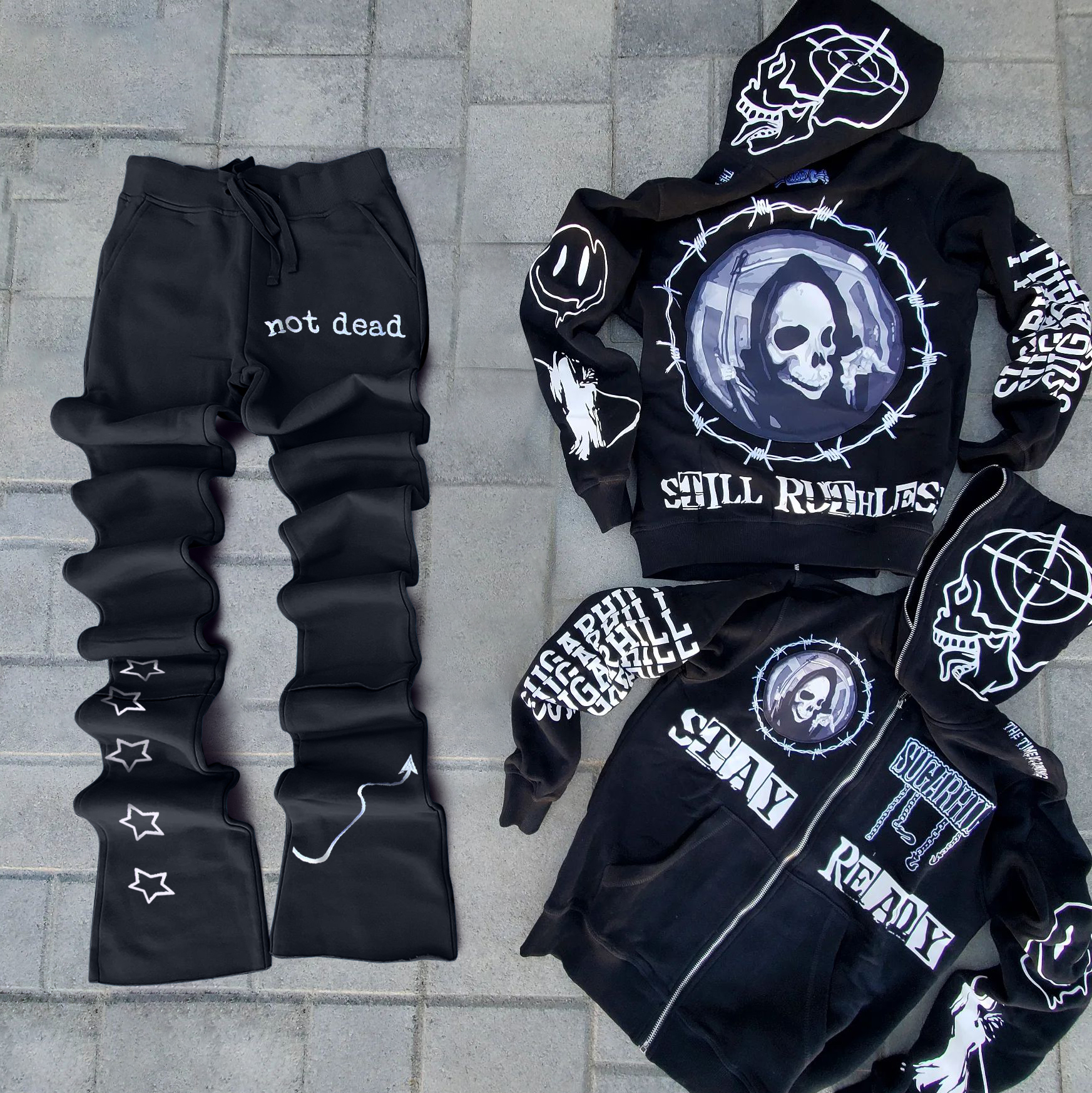 Retro Skull Full Zip Hoodie Flared Pants Set