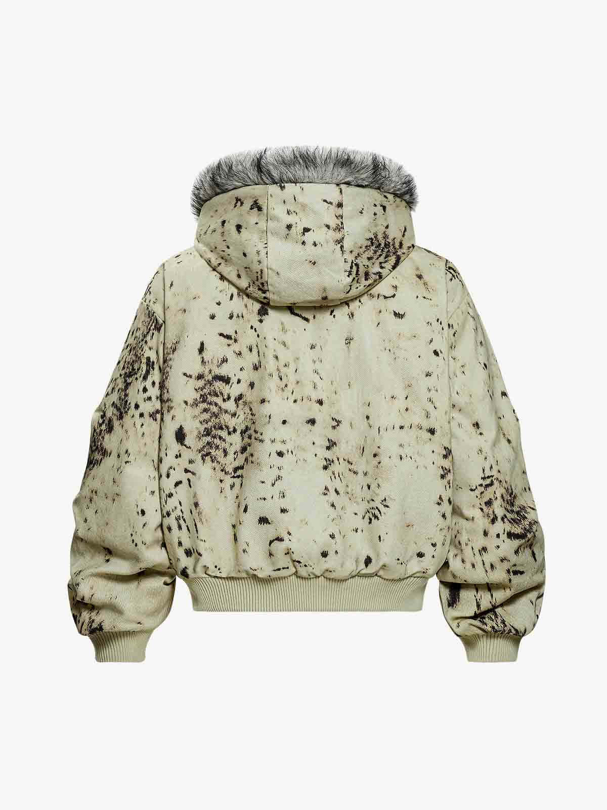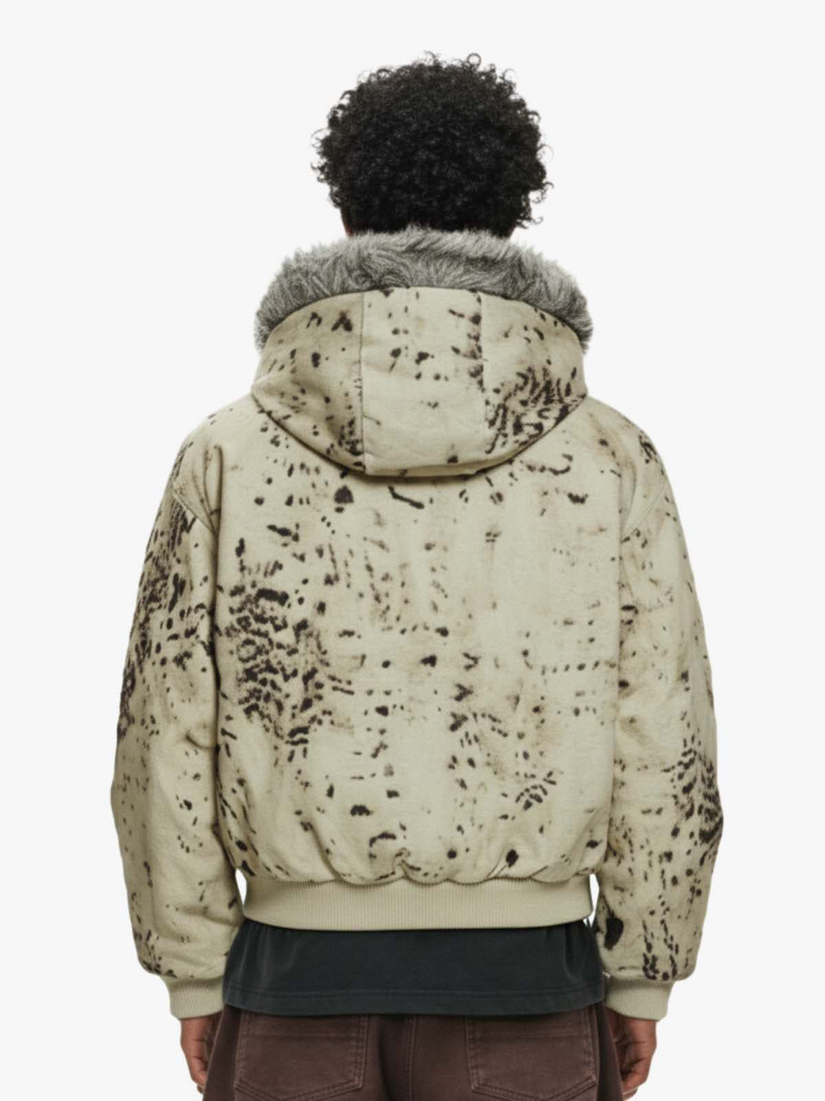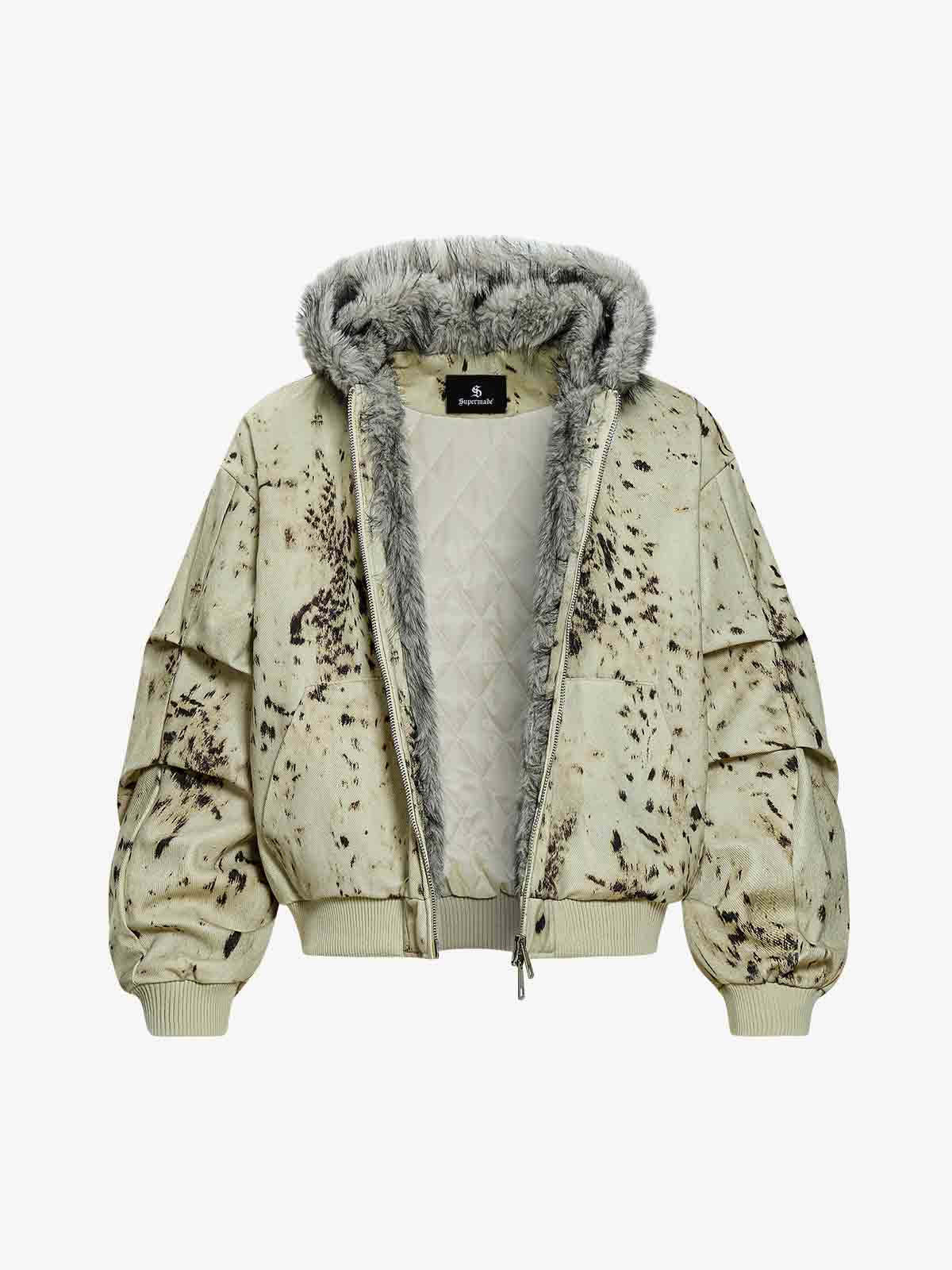 Splatter Print Faux Fur Collar Ruched Sleeve Zip-Up Jacket