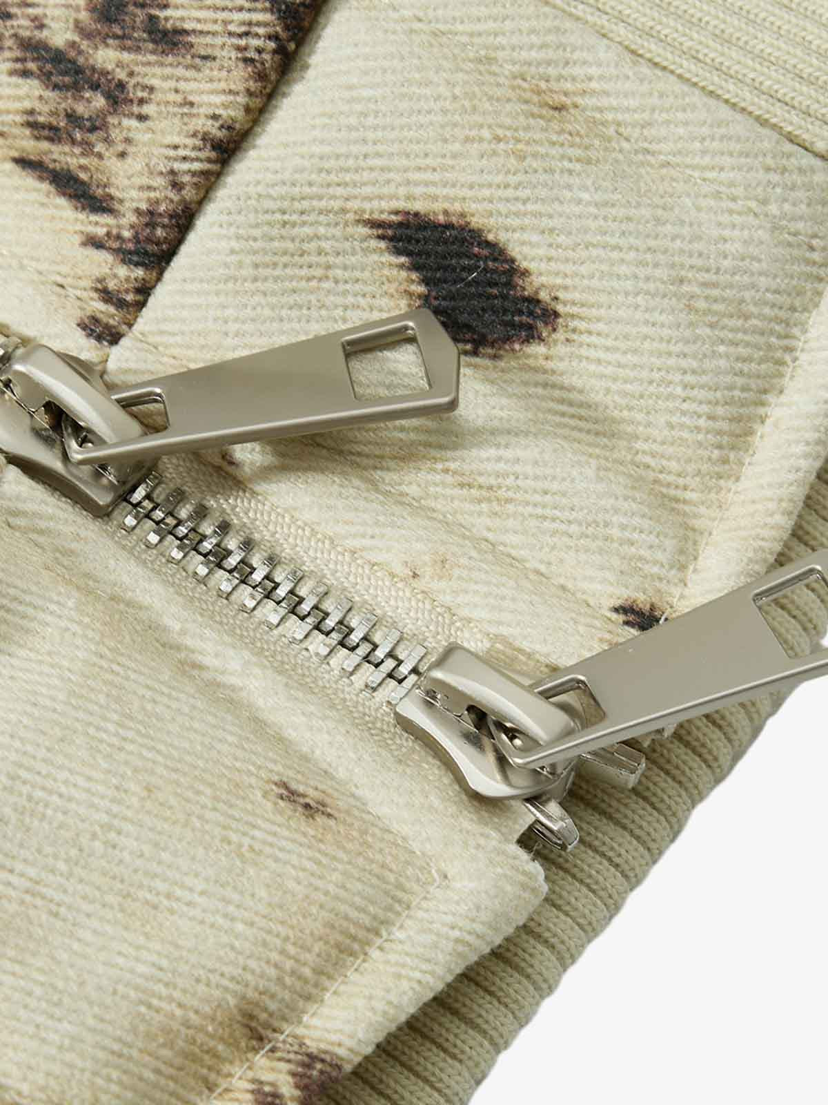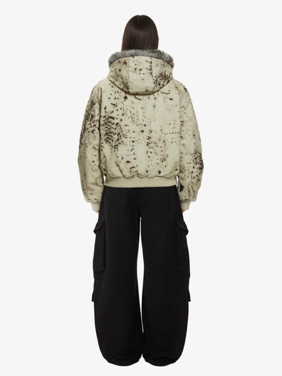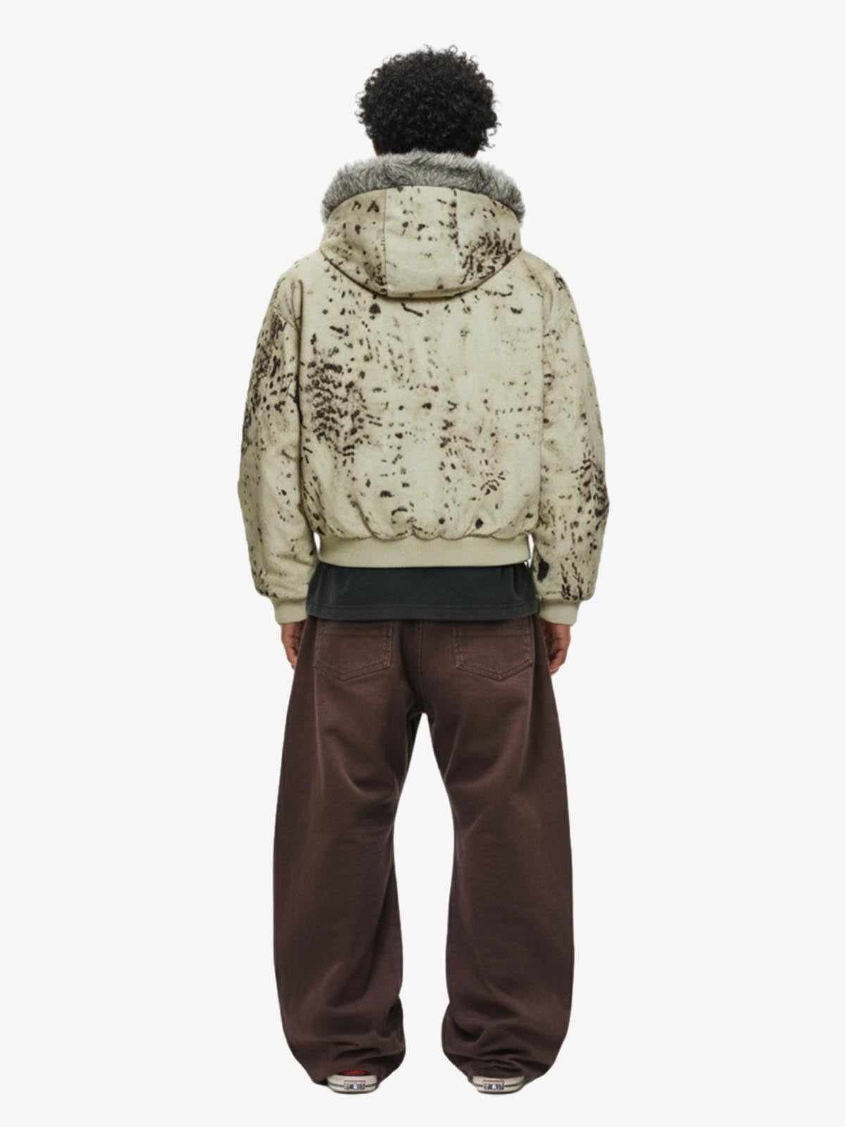 Splatter Print Faux Fur Collar Ruched Sleeve Zip-Up Jacket