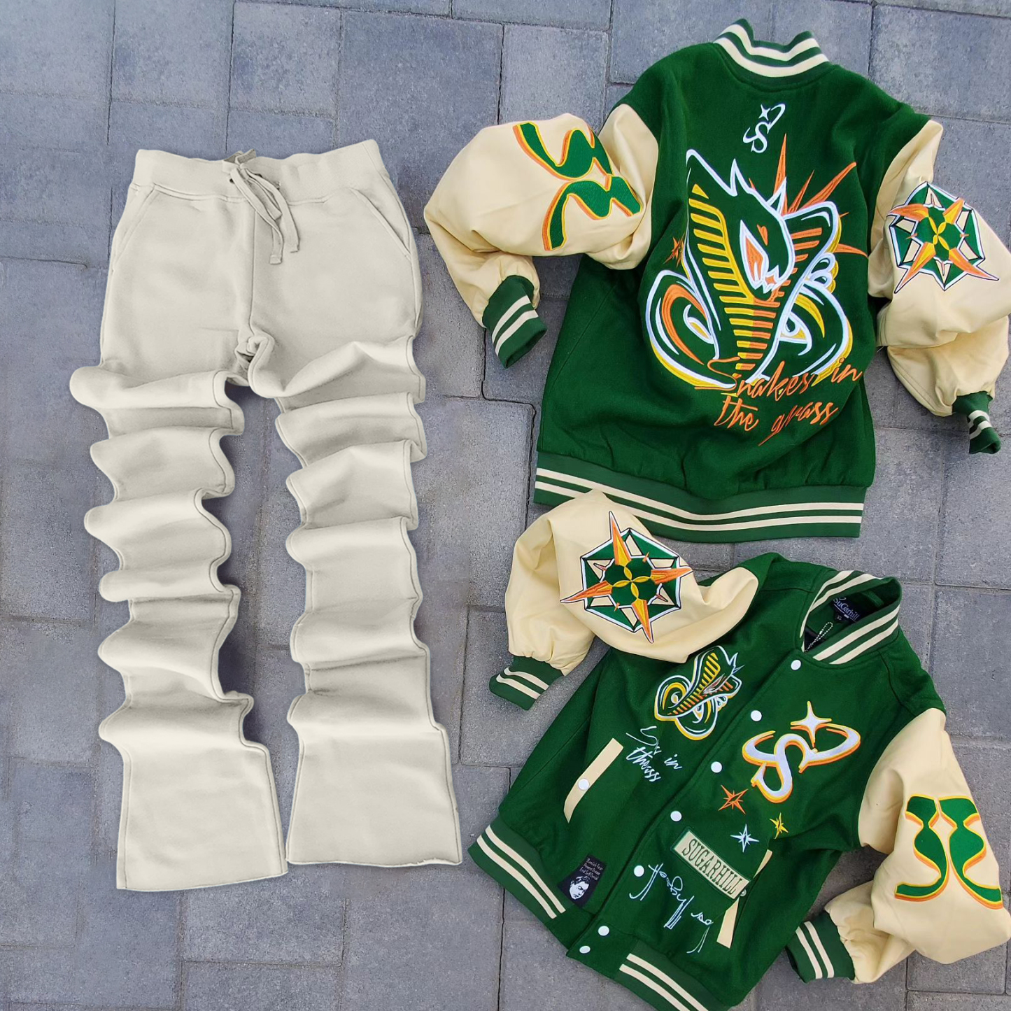 Stylish contrasting color baseball jacket and flared pants suit