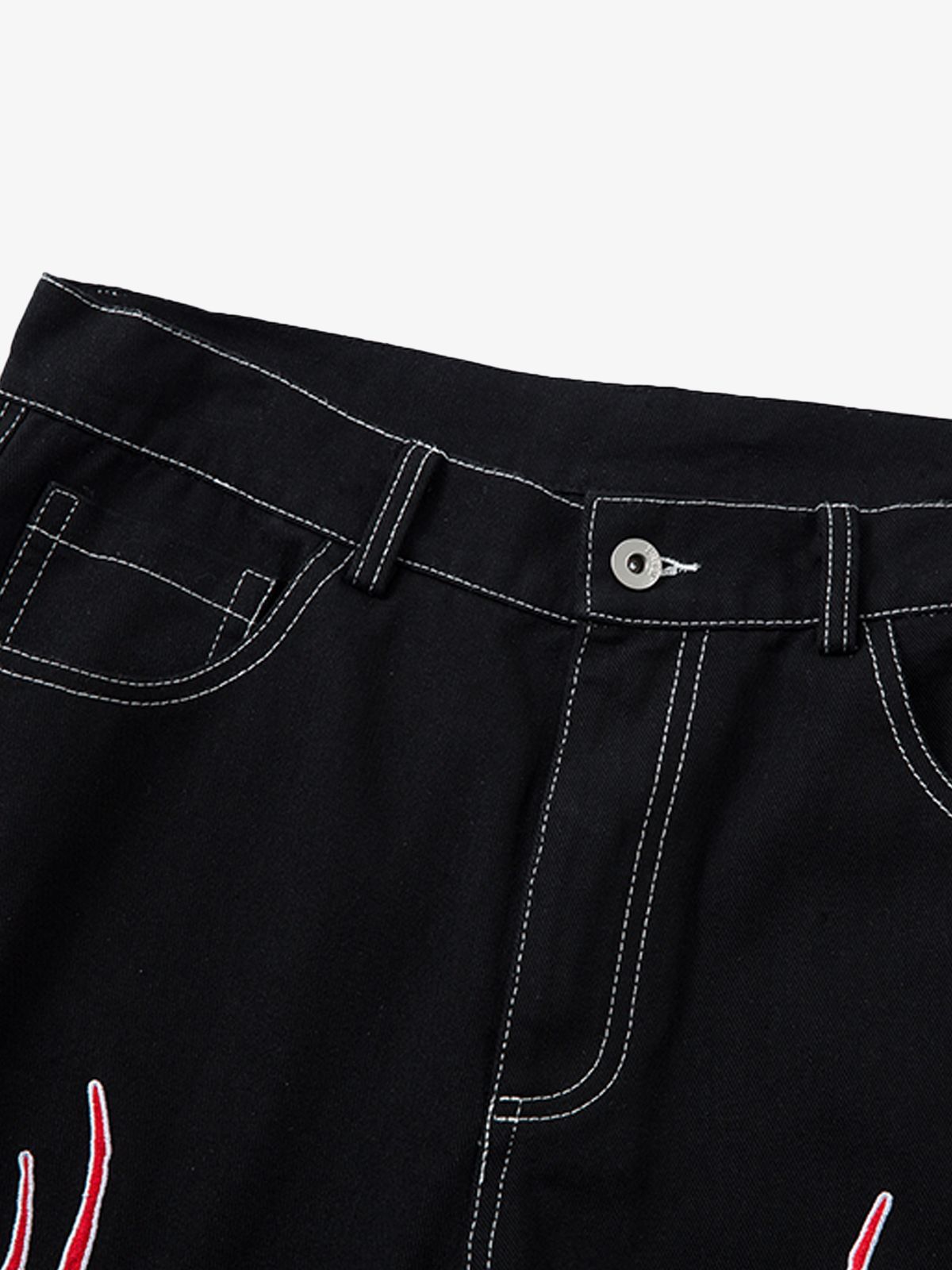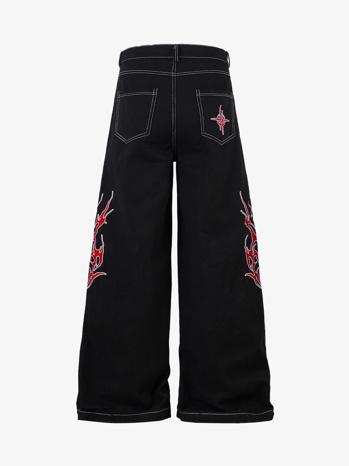Contrast Flame Embroidered Baggy Jeans - 2364