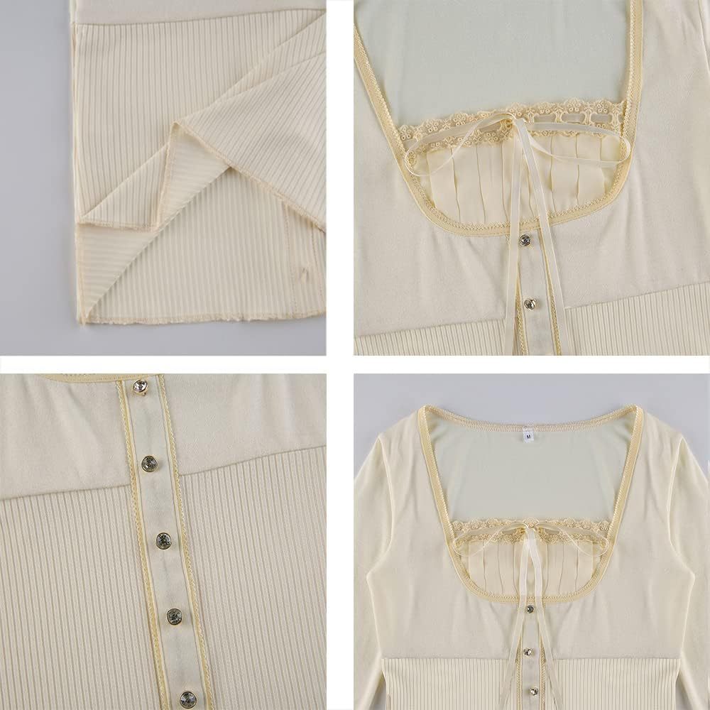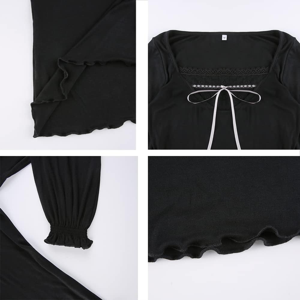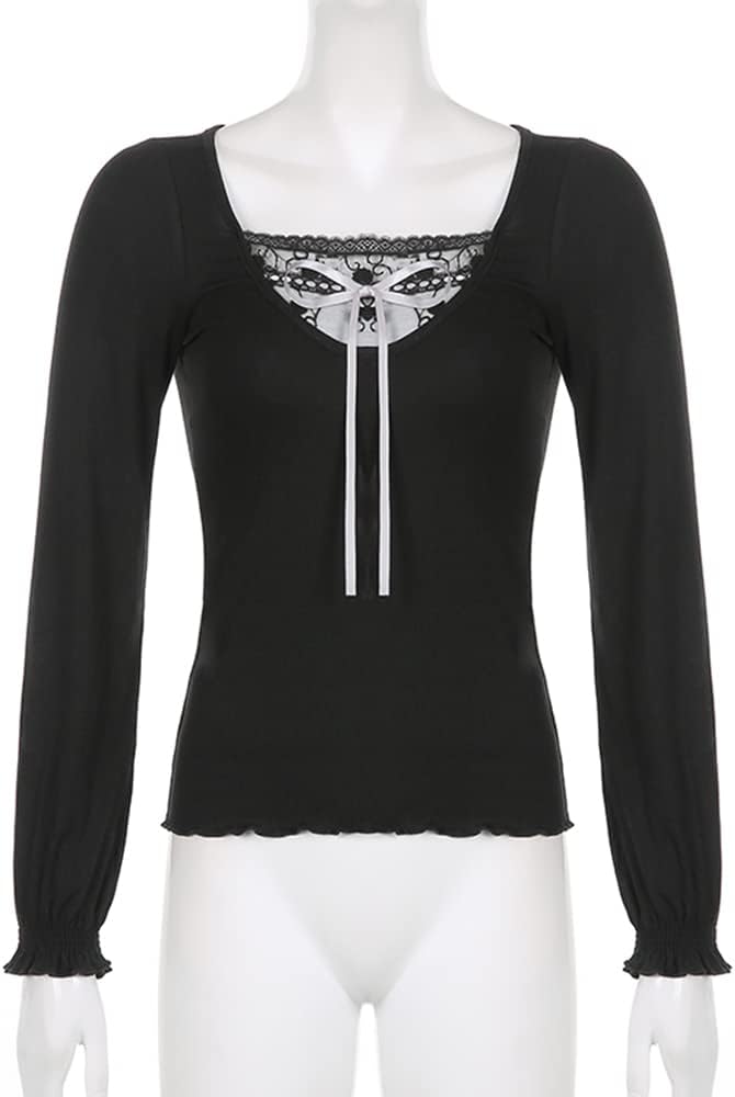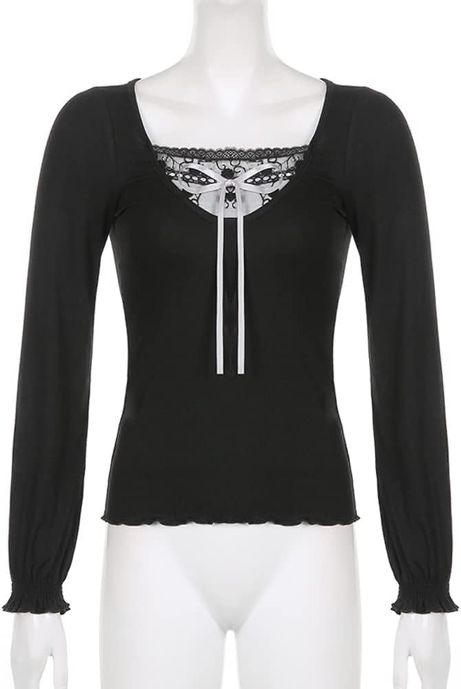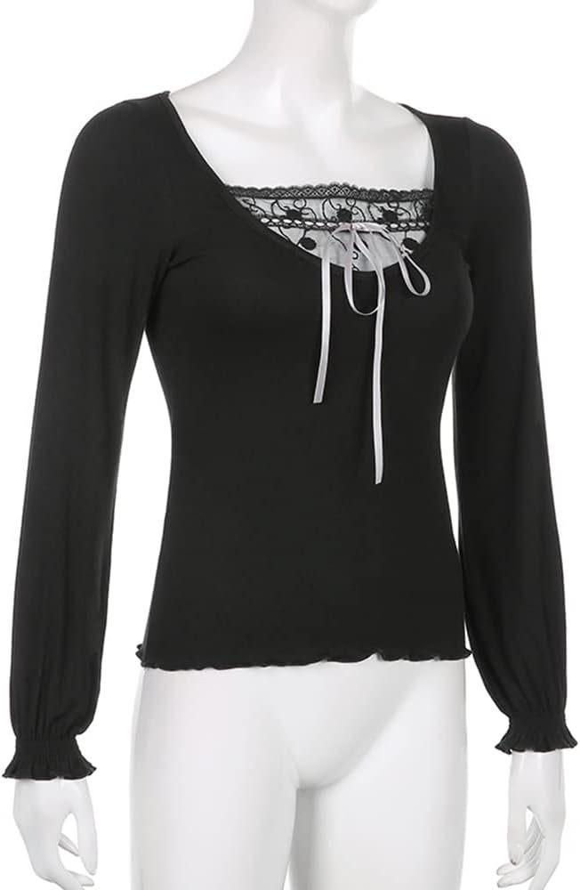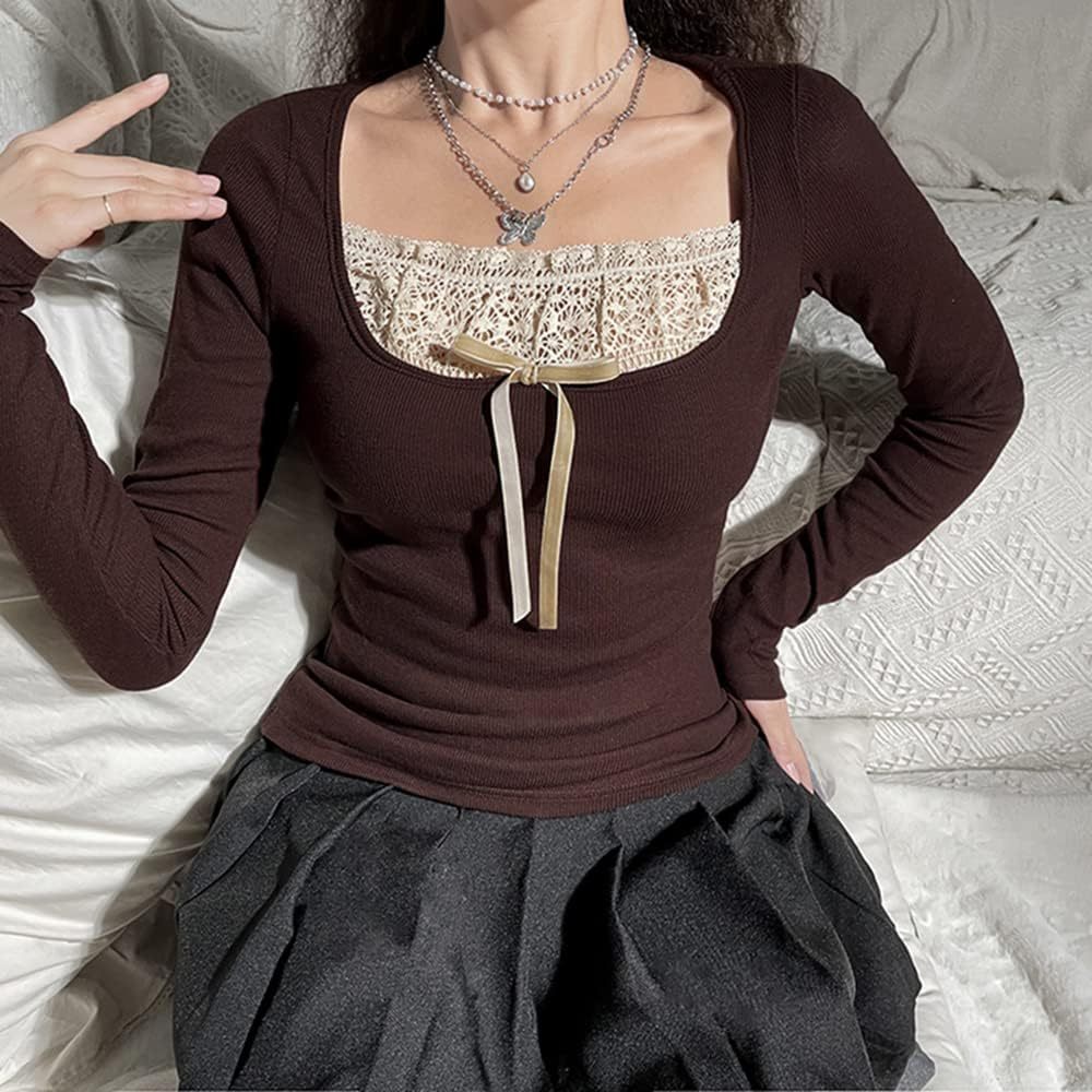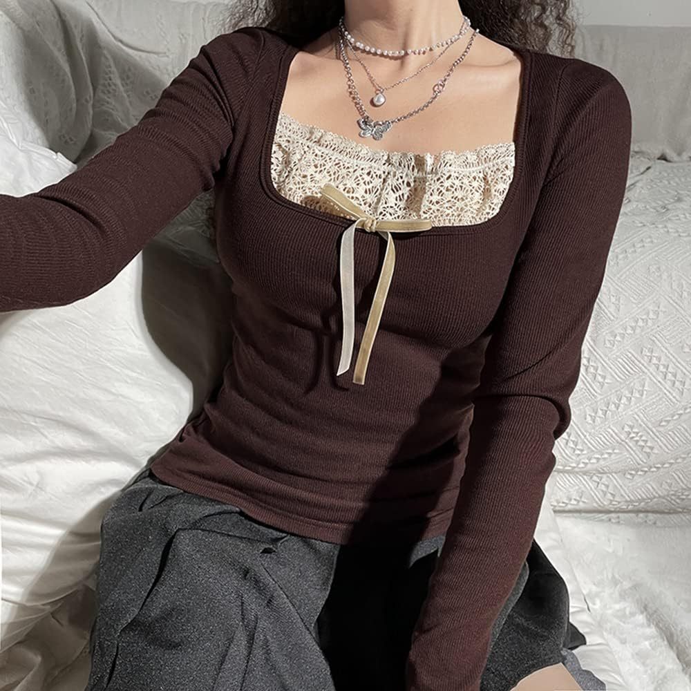 Women Y2K Long Sleeve Patchwork Lace Square Neck Crop Top Tshirt Slim Fit Harajuku Vintage Streetwear Blouse Tops
