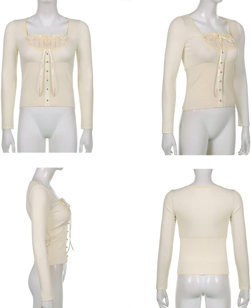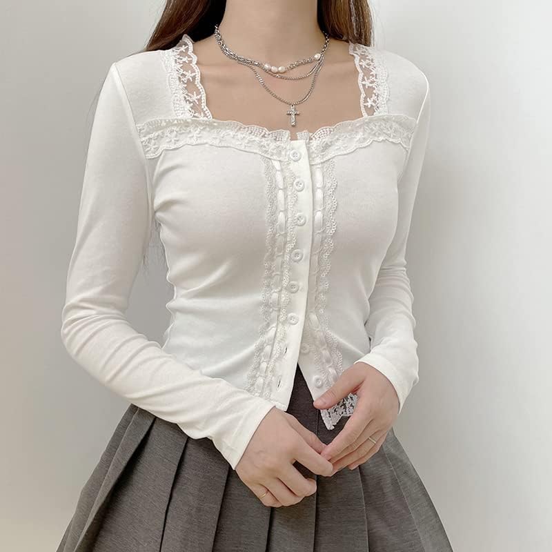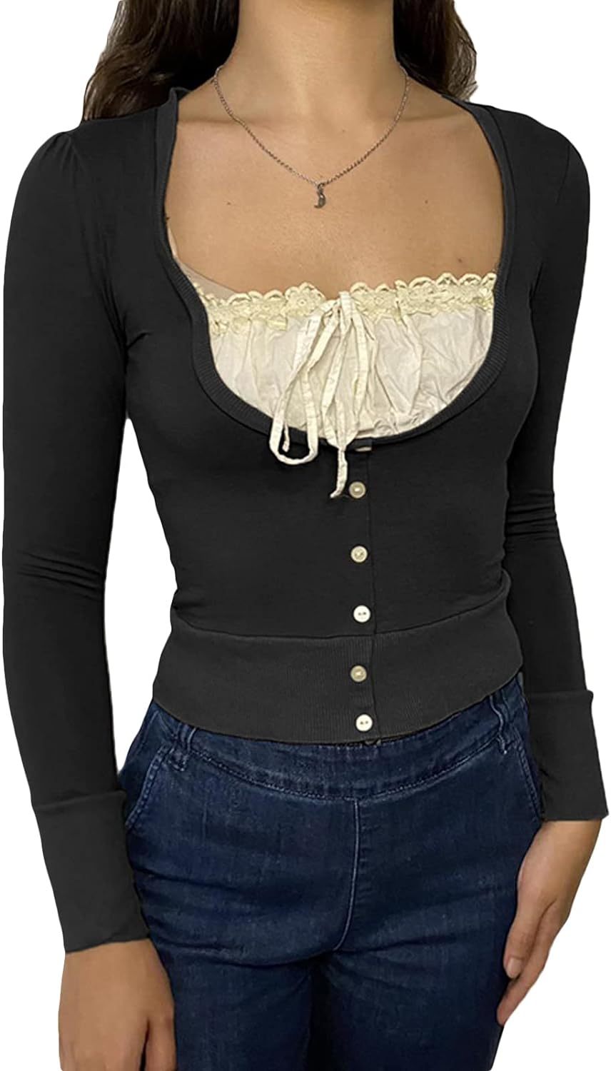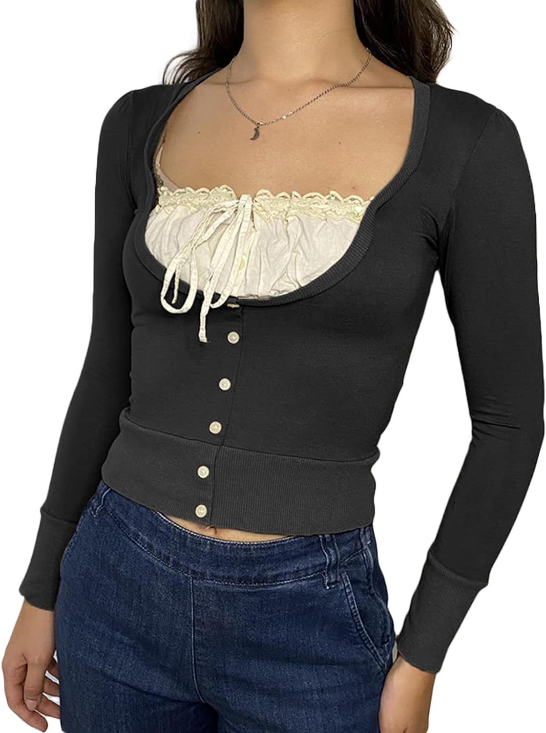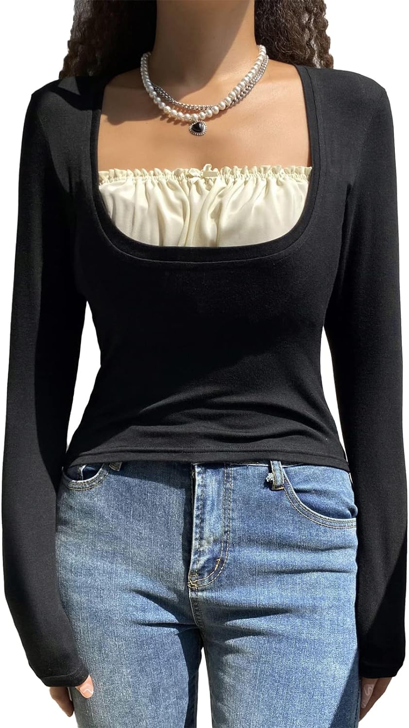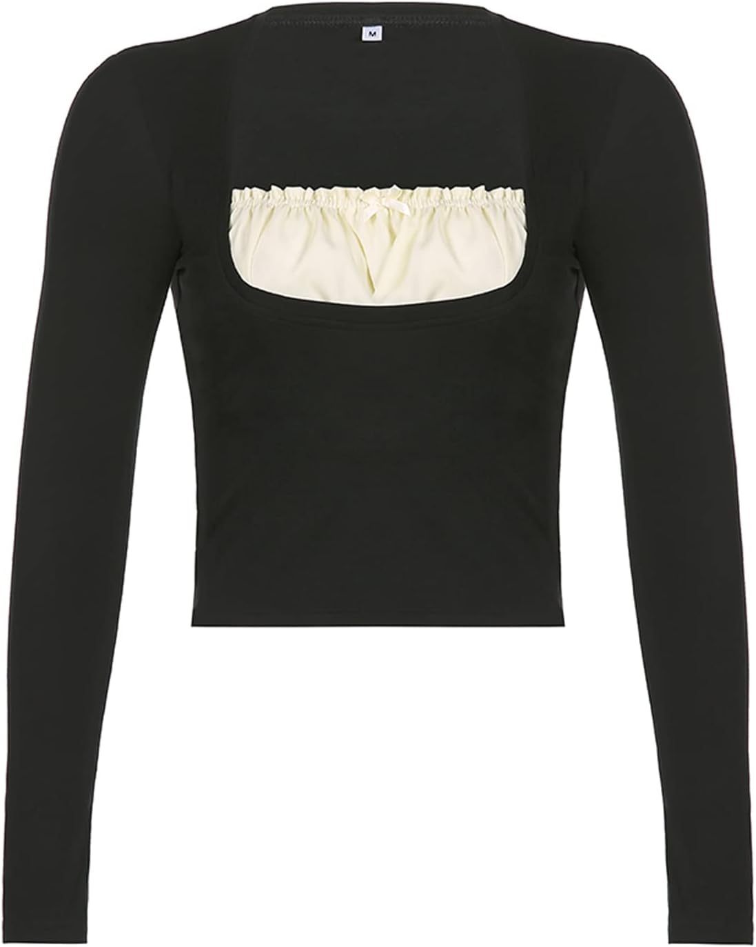 Women Y2K Long Sleeve Patchwork Lace Square Neck Crop Top Tshirt Slim Fit Harajuku Vintage Streetwear Blouse Tops