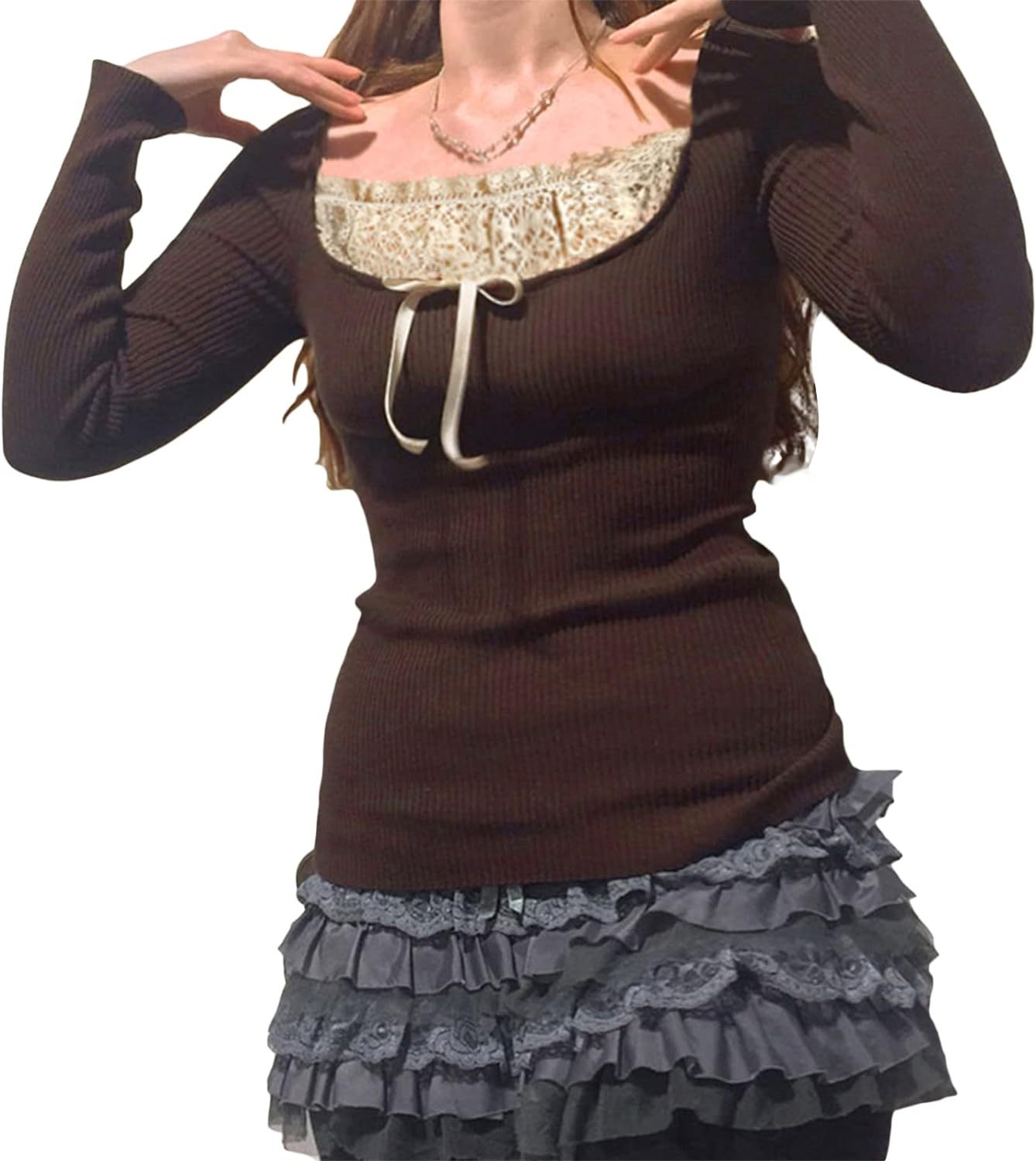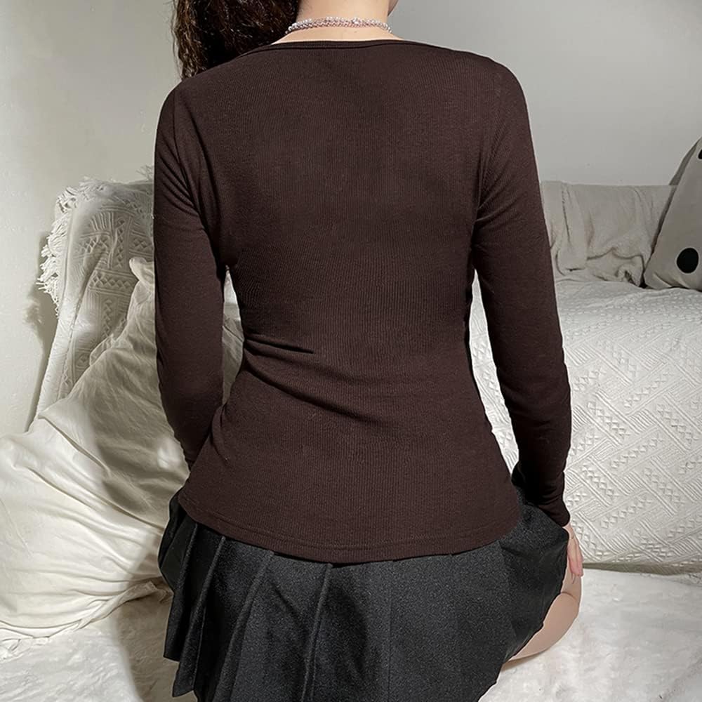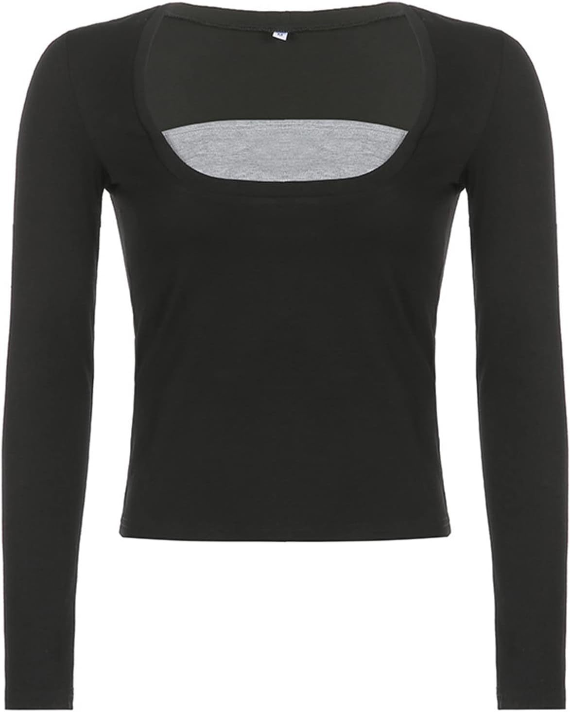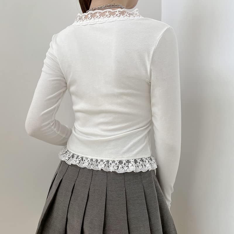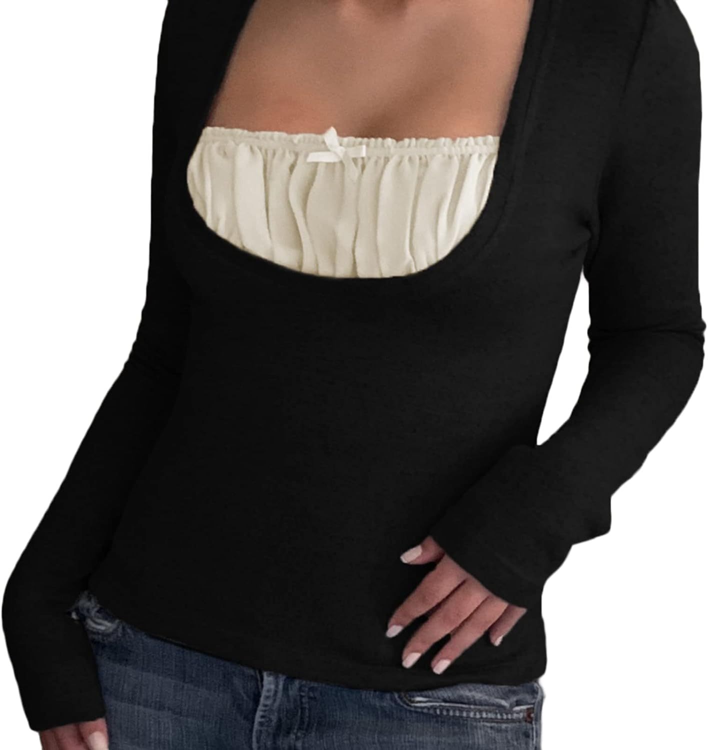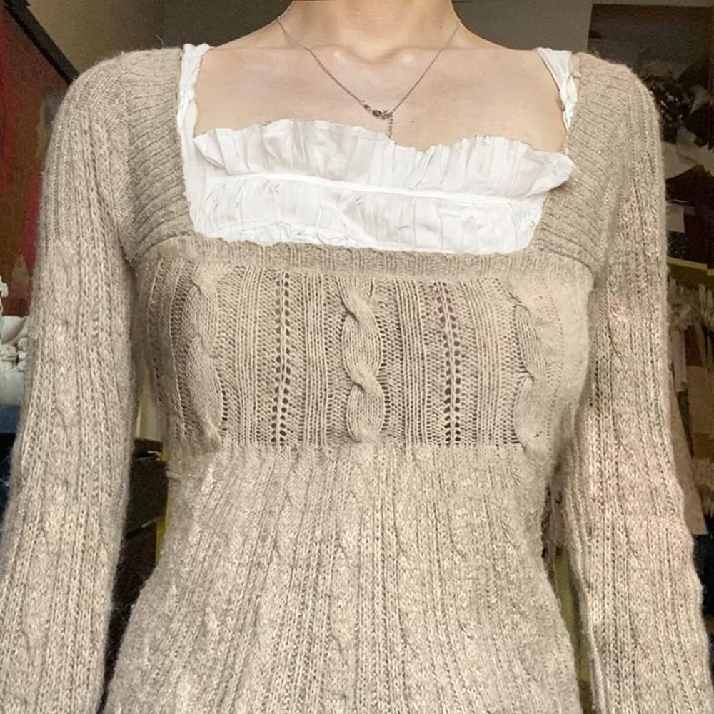Women Y2K Long Sleeve Patchwork Lace Square Neck Crop Top Tshirt Slim Fit Harajuku Vintage Streetwear Blouse Tops