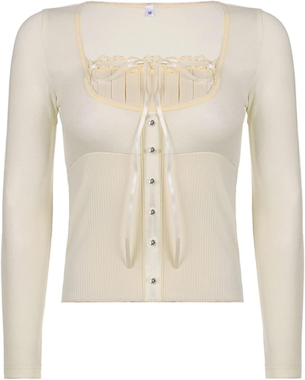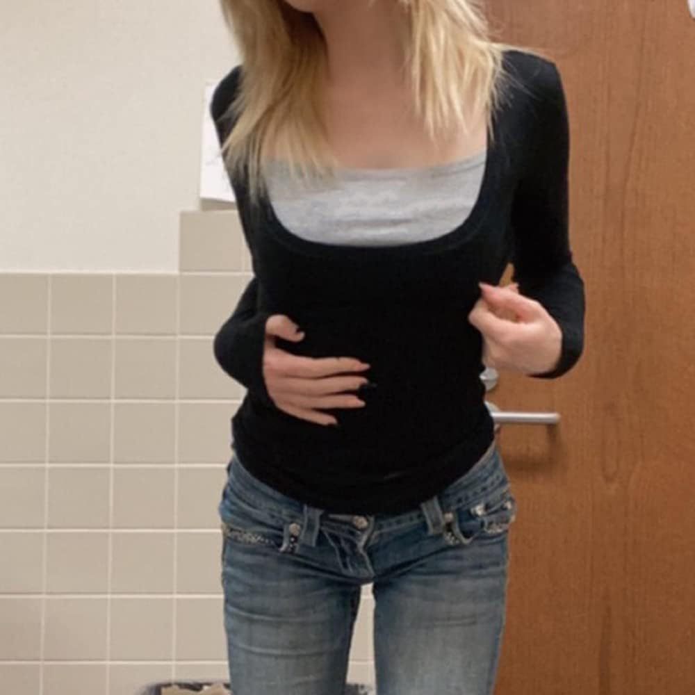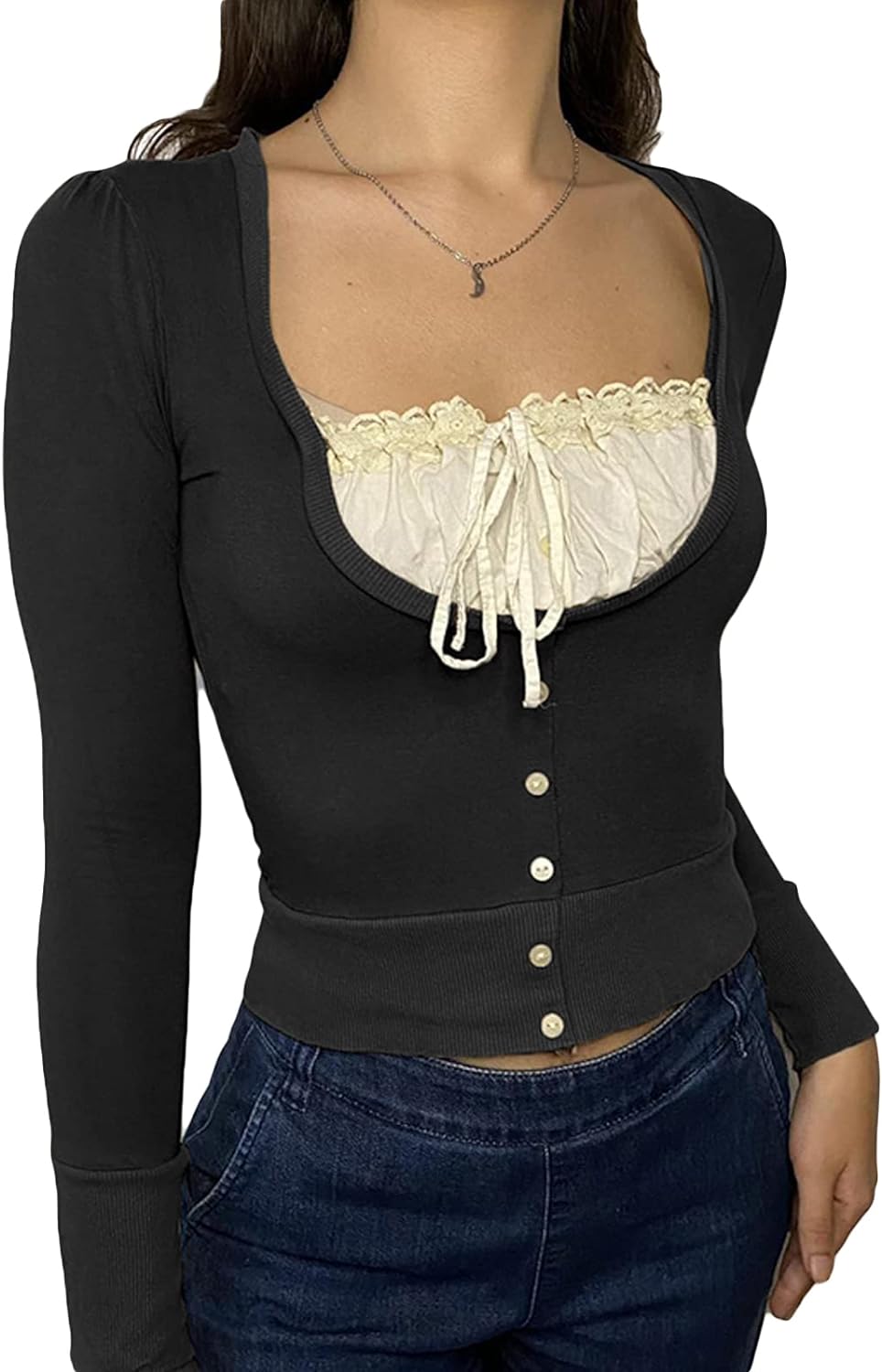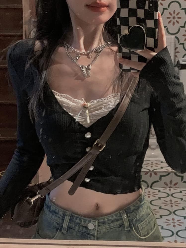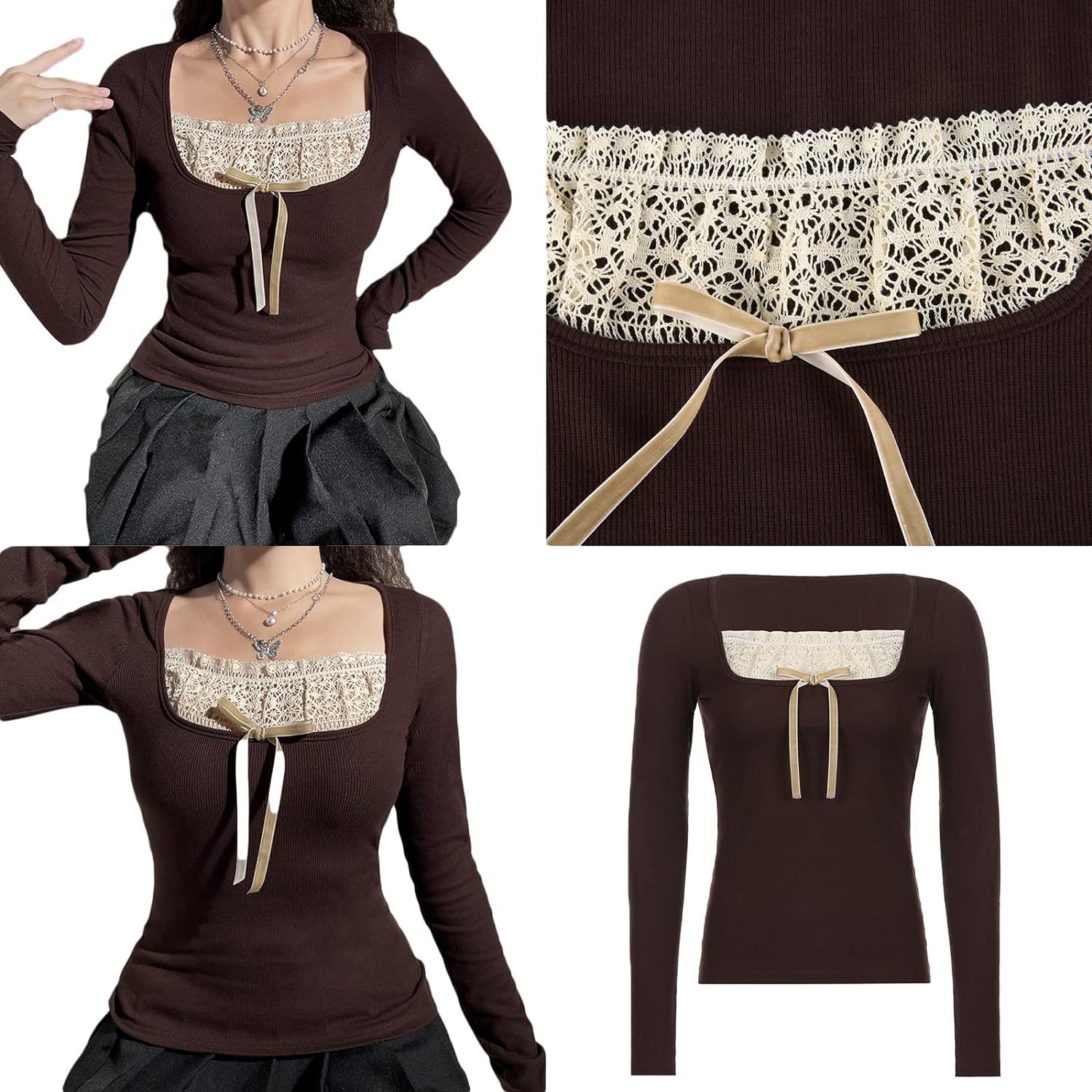 Women Y2K Long Sleeve Patchwork Lace Square Neck Crop Top Tshirt Slim Fit Harajuku Vintage Streetwear Blouse Tops