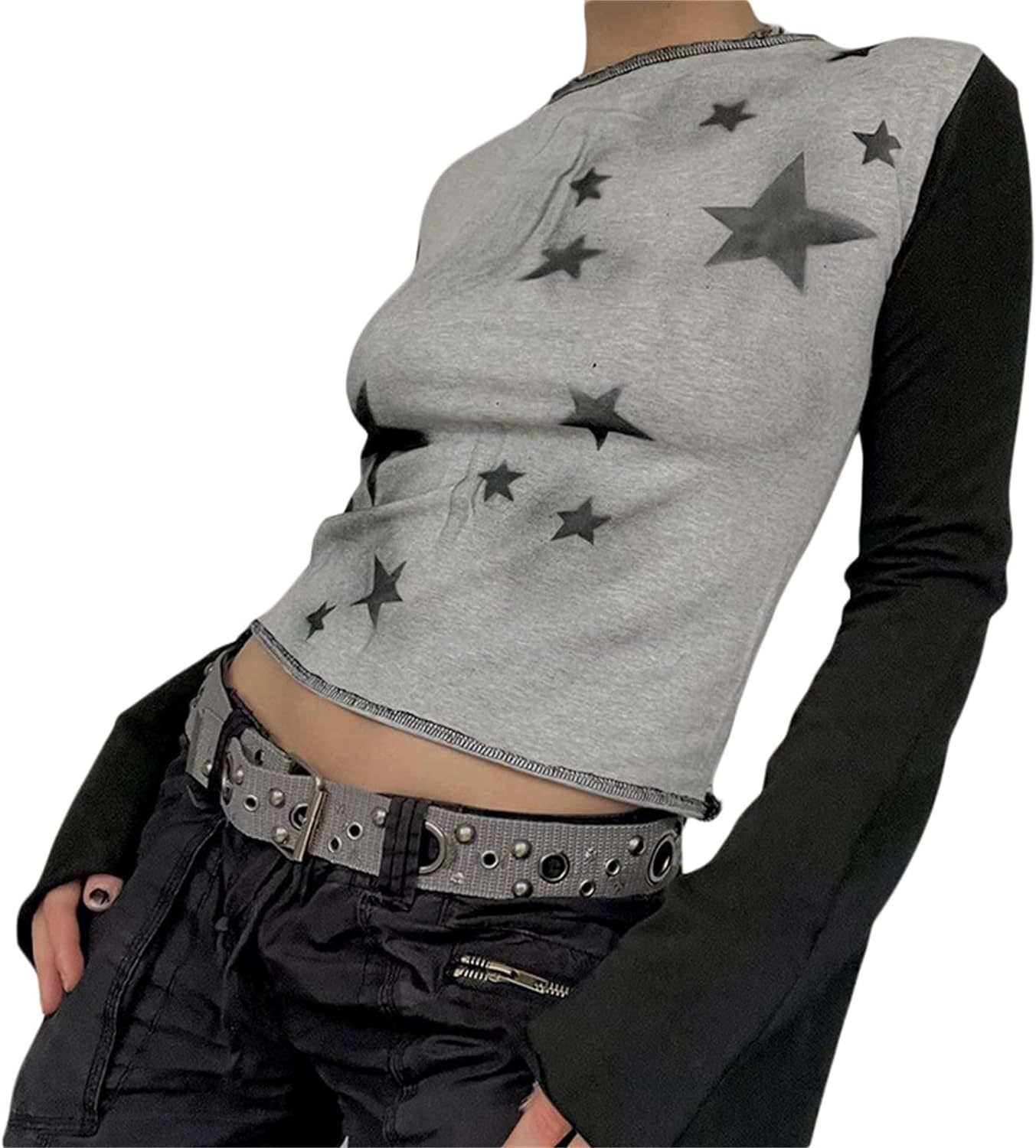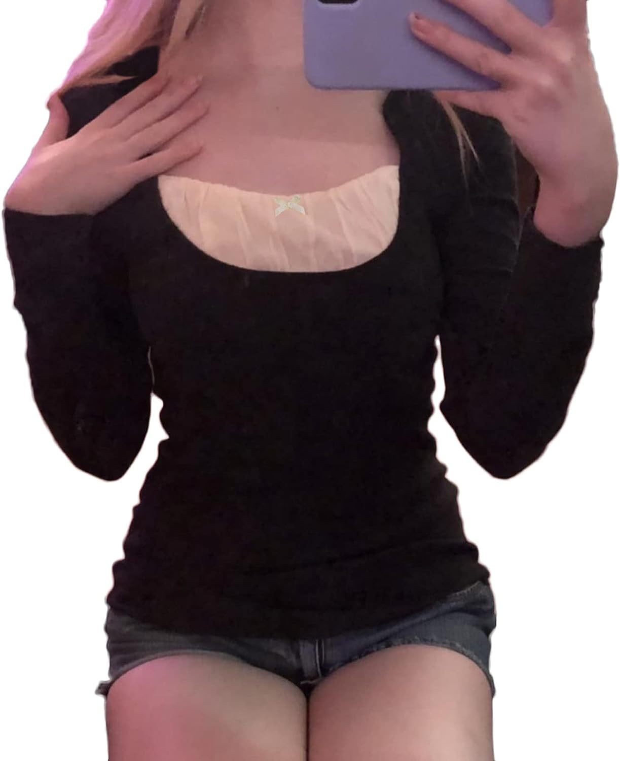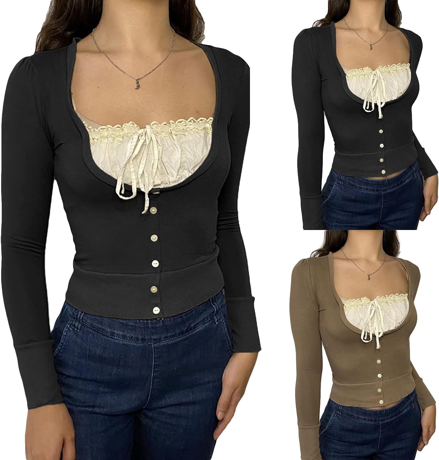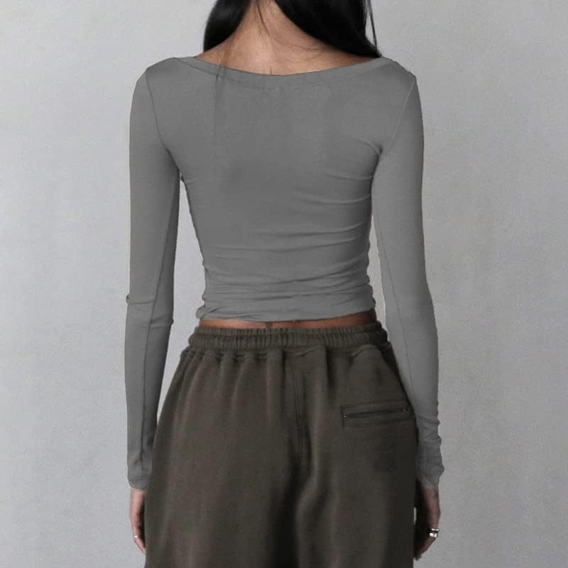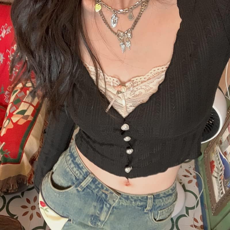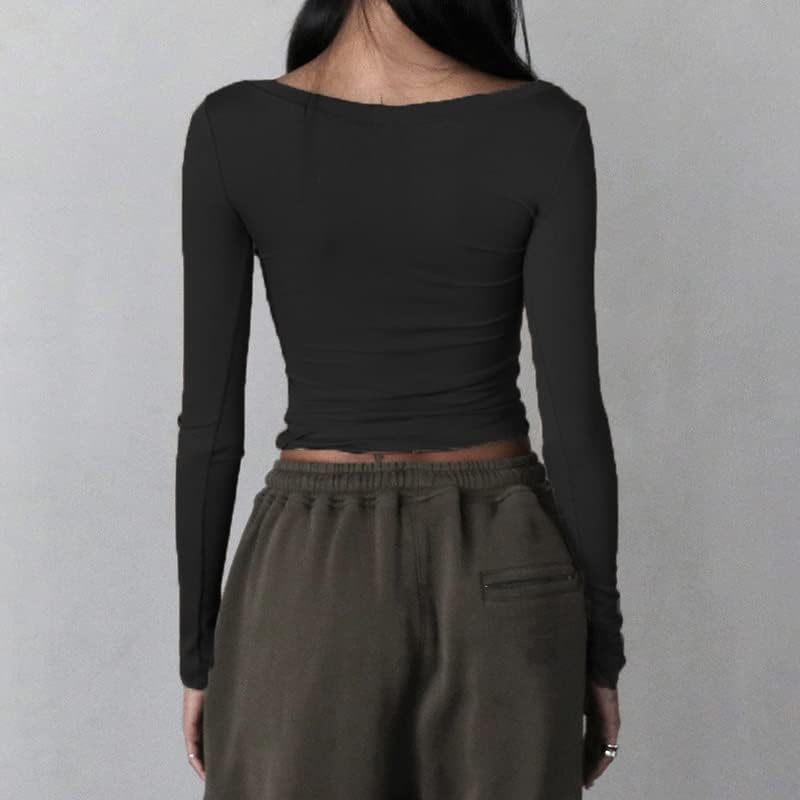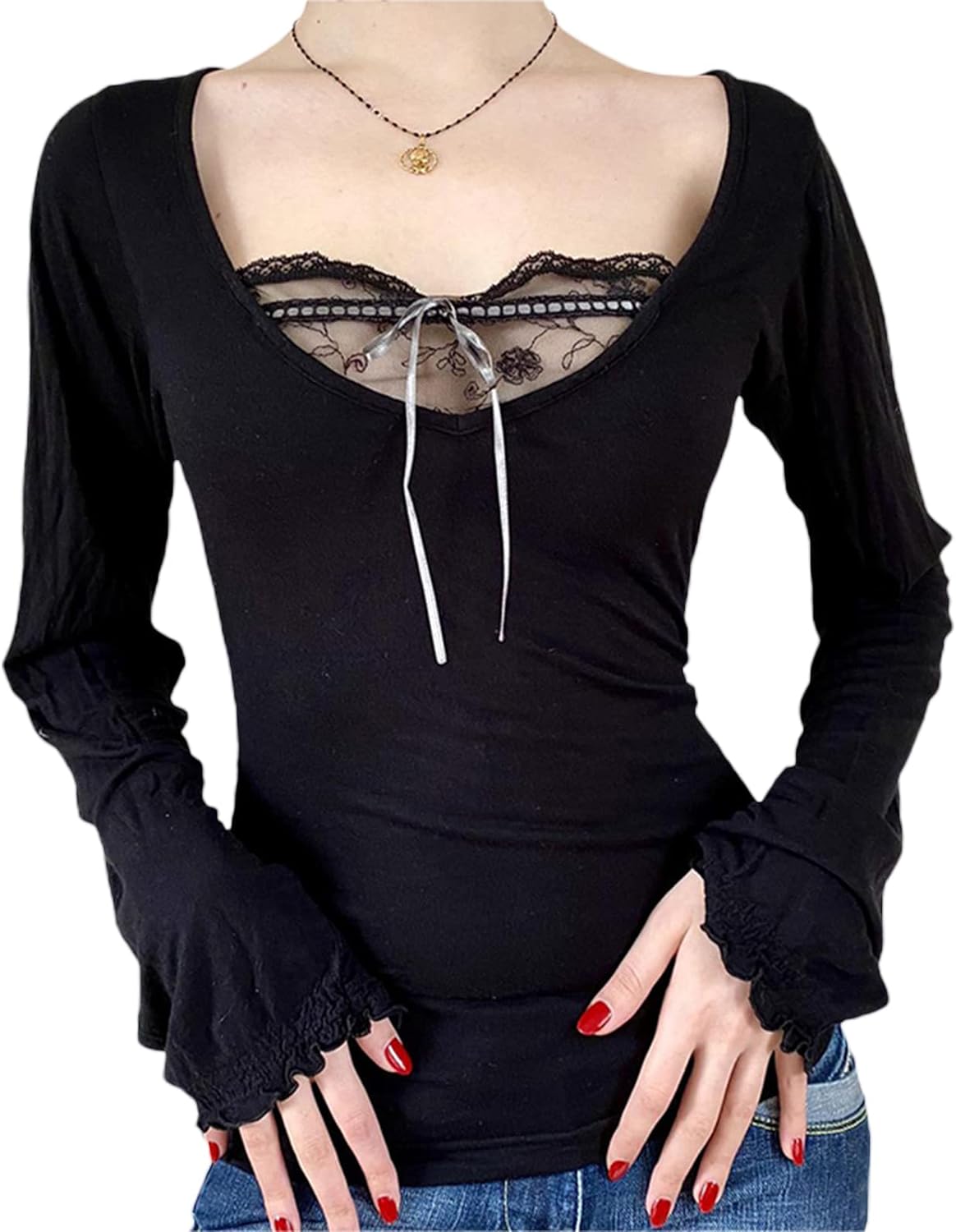 Women Y2K Long Sleeve Patchwork Lace Square Neck Crop Top Tshirt Slim Fit Harajuku Vintage Streetwear Blouse Tops