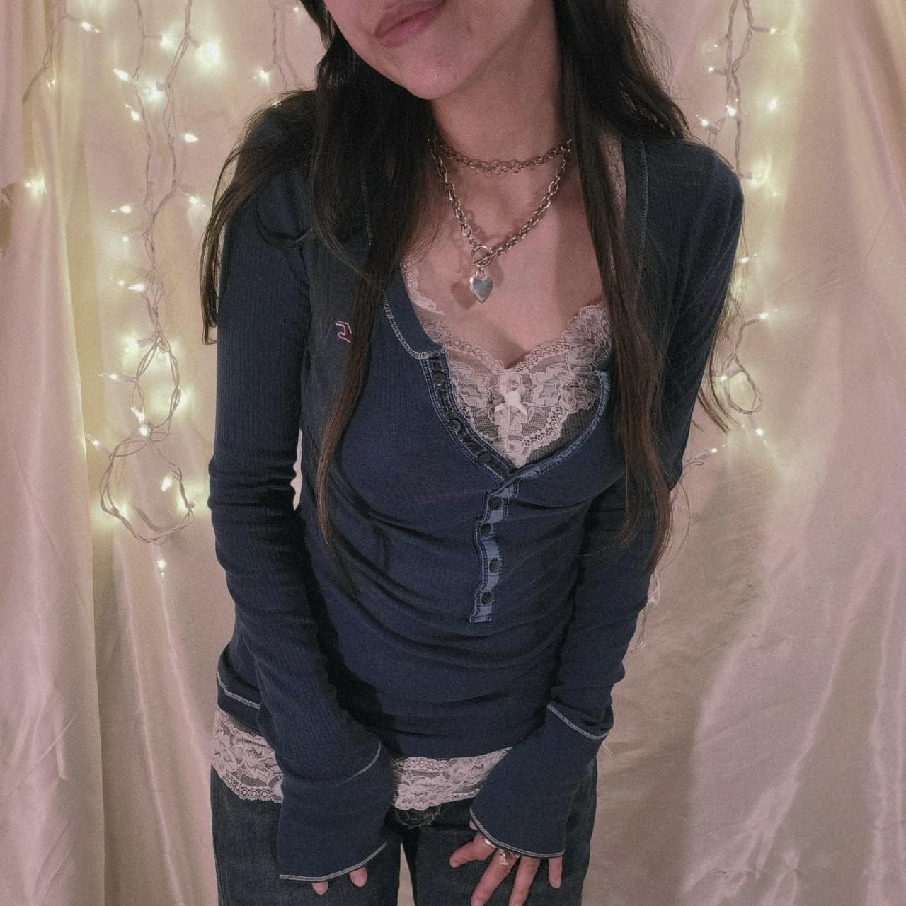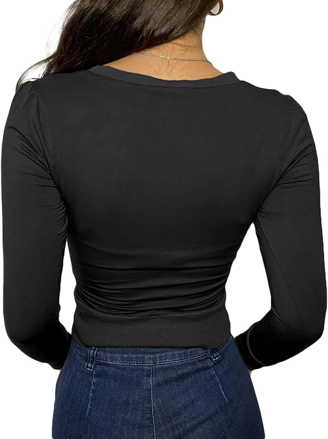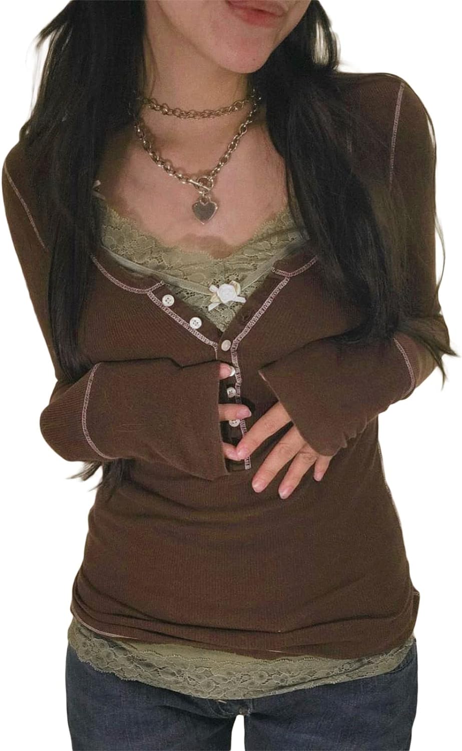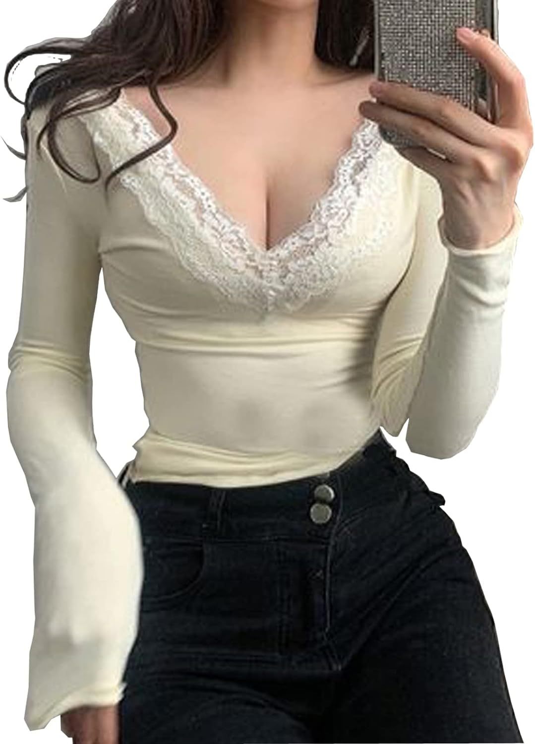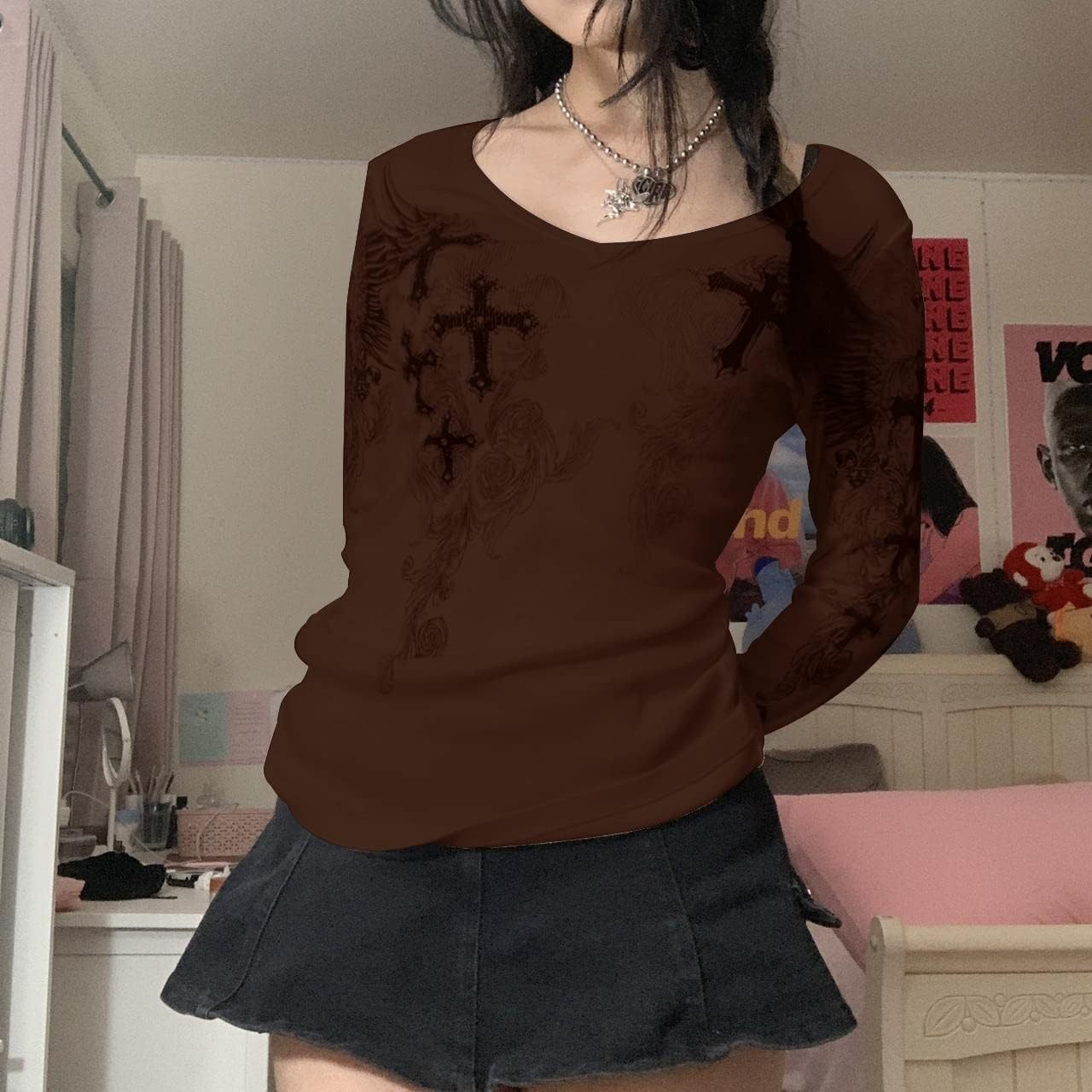 Women Y2K Long Sleeve Patchwork Lace Square Neck Crop Top Tshirt Slim Fit Harajuku Vintage Streetwear Blouse Tops