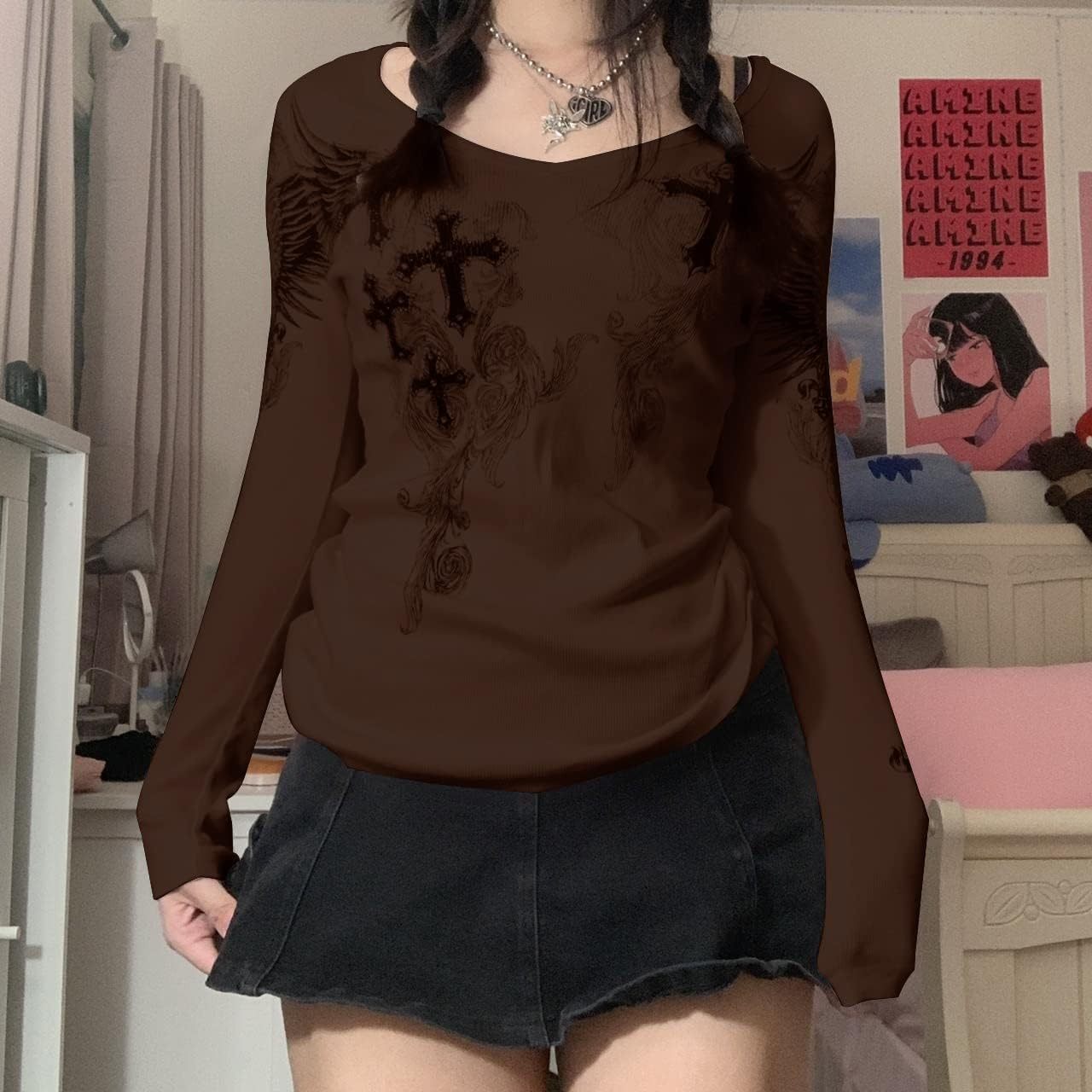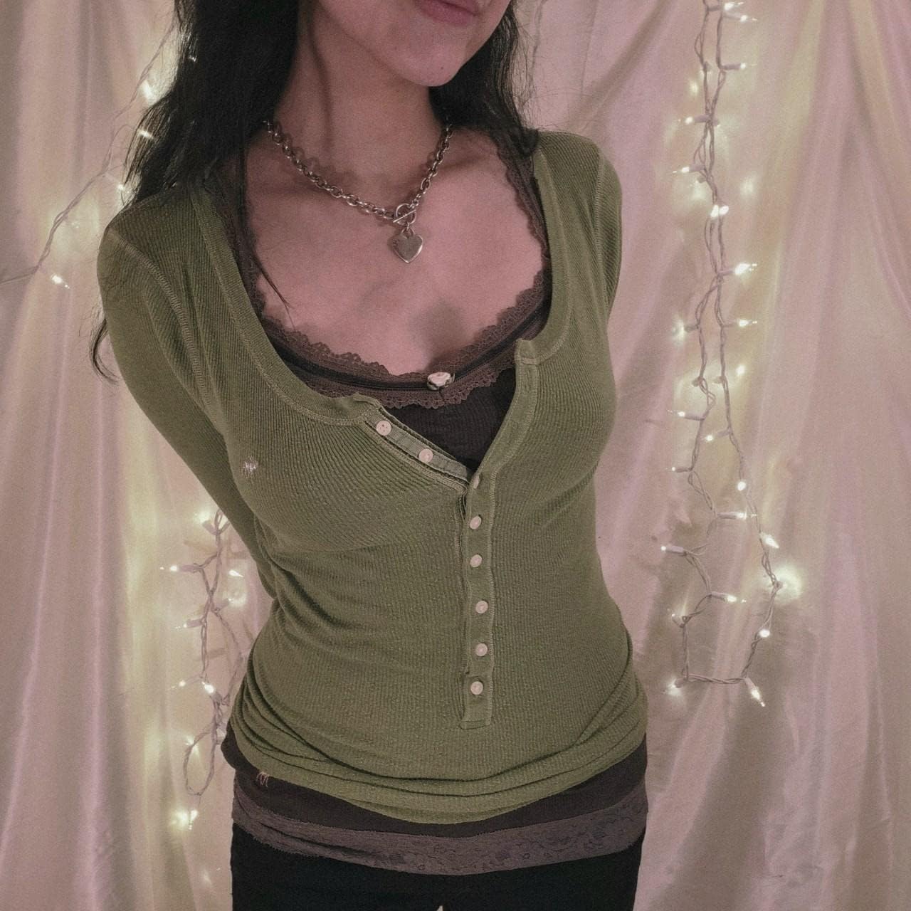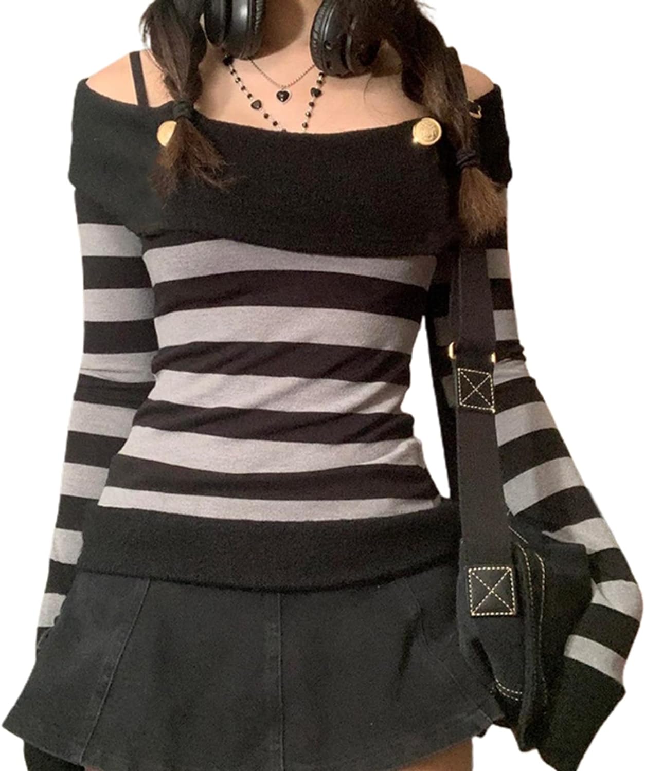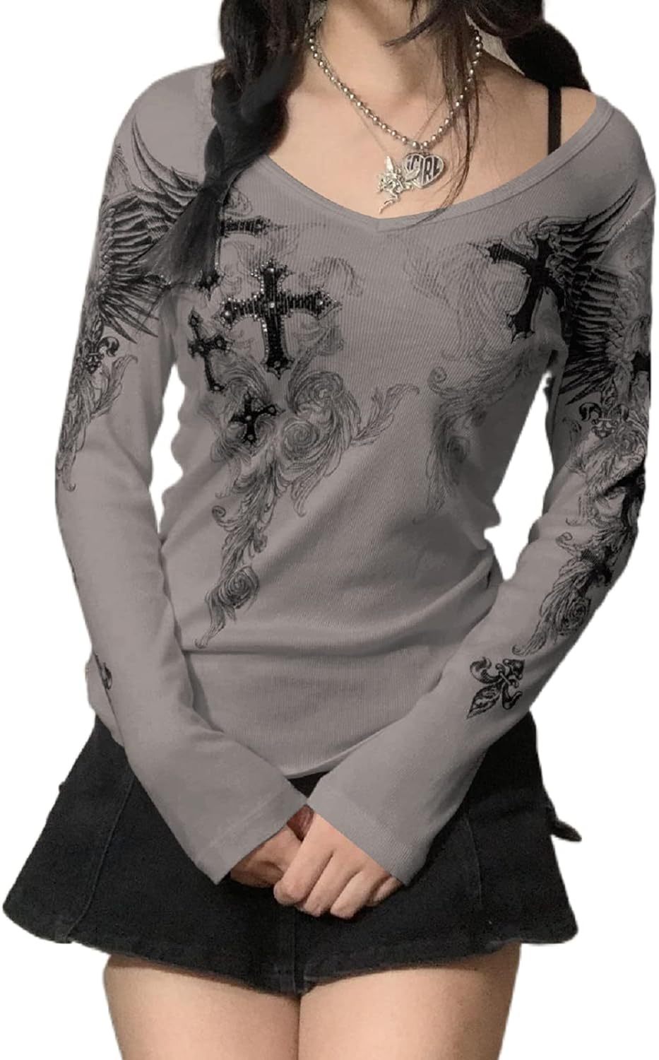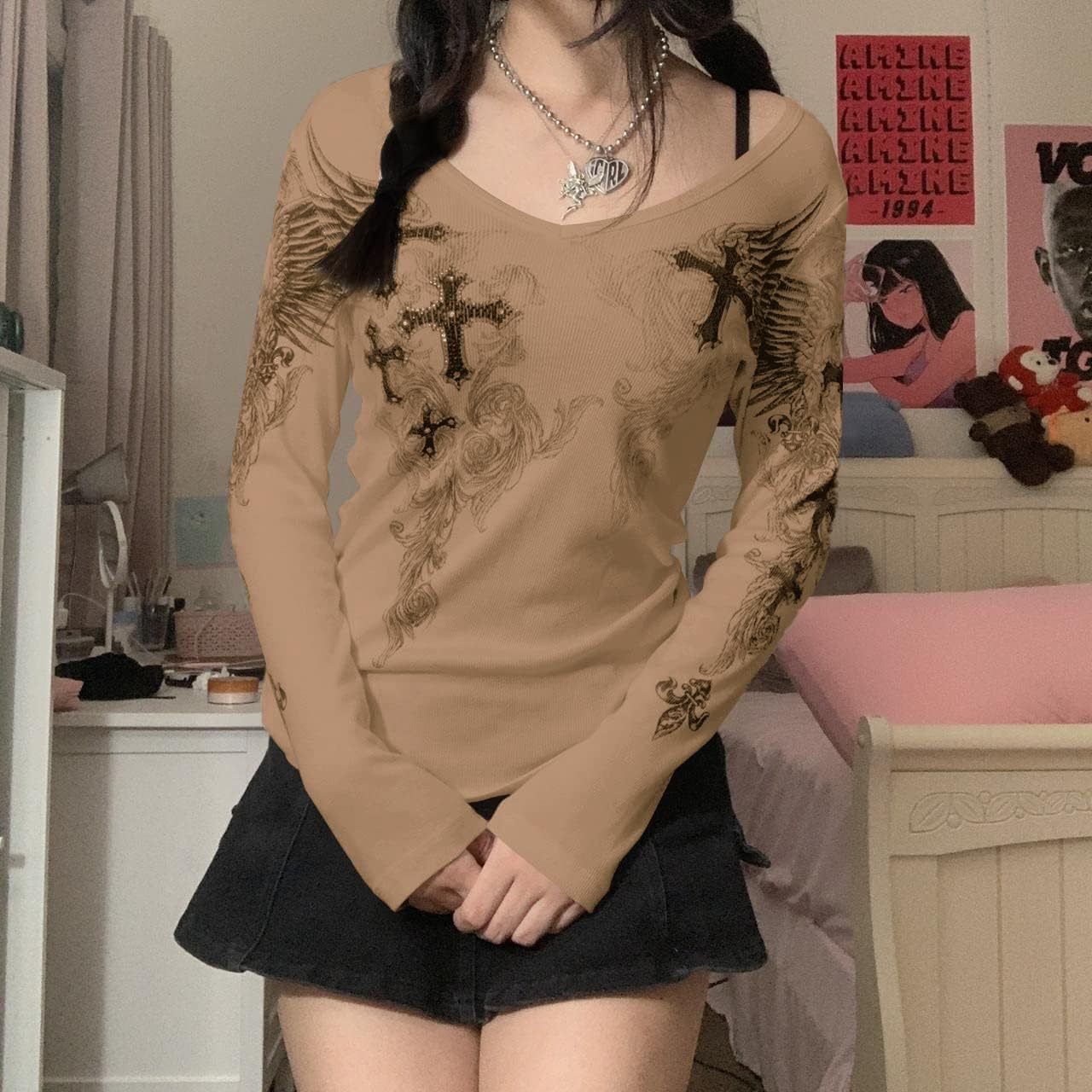 Women Y2K Long Sleeve Patchwork Lace Square Neck Crop Top Tshirt Slim Fit Harajuku Vintage Streetwear Blouse Tops