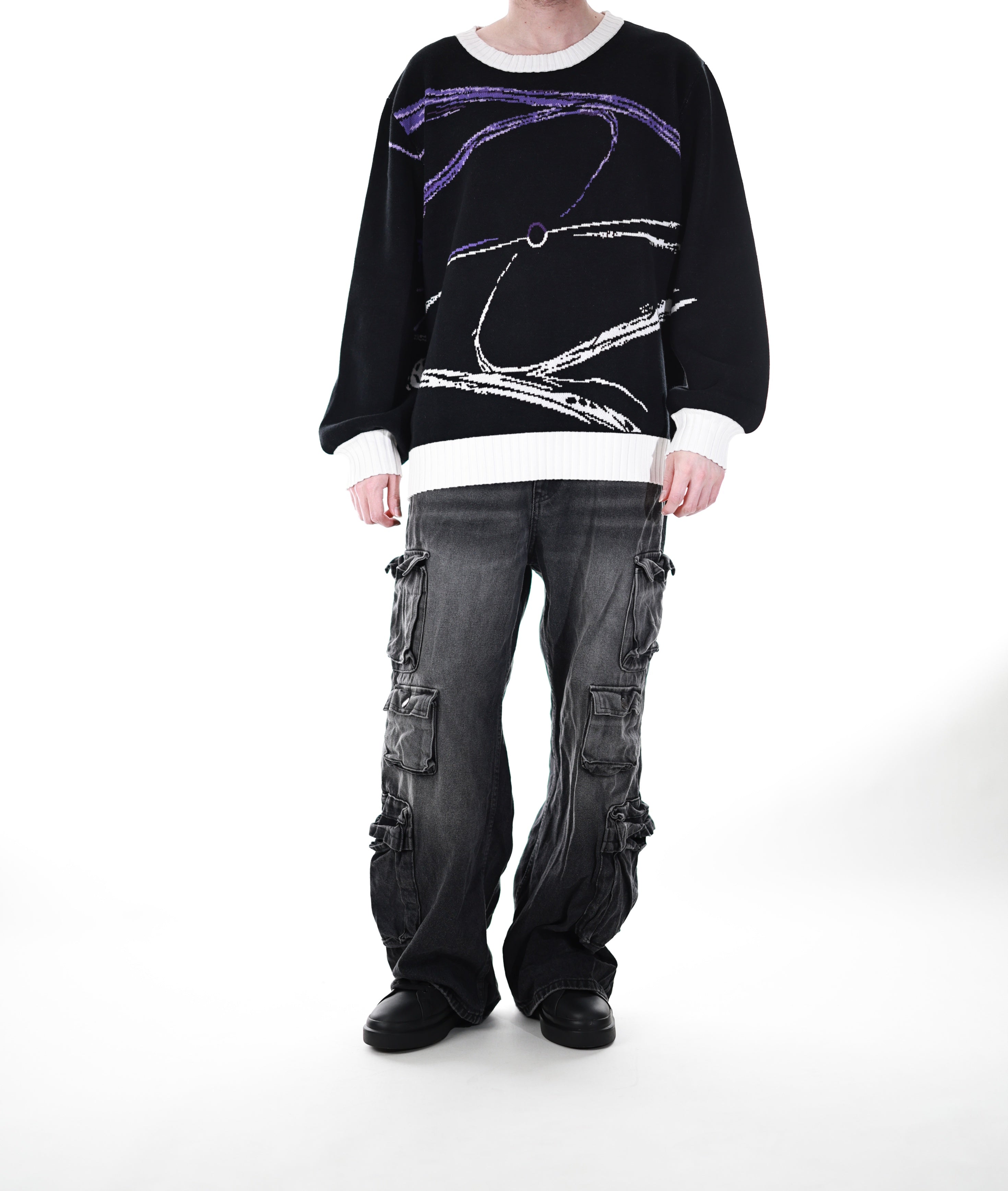 This whole collection features some of the most detailed knit designs we have ever made. The fabric is made from jacquard knit and the highest quality 100% cotton yarns. Jacquard is a very high end manufacturing technique that retains color as good as embroidery while maintaining the softness of an item with no pattern. The patterns add a powerful touch inspired by Hollow purple. The design has the same shape as our Toji sweater since this was the shape you guys liked the most and is perfect to casually wear on the street. It is supposed to make you comfortable while standing out in a positive way.