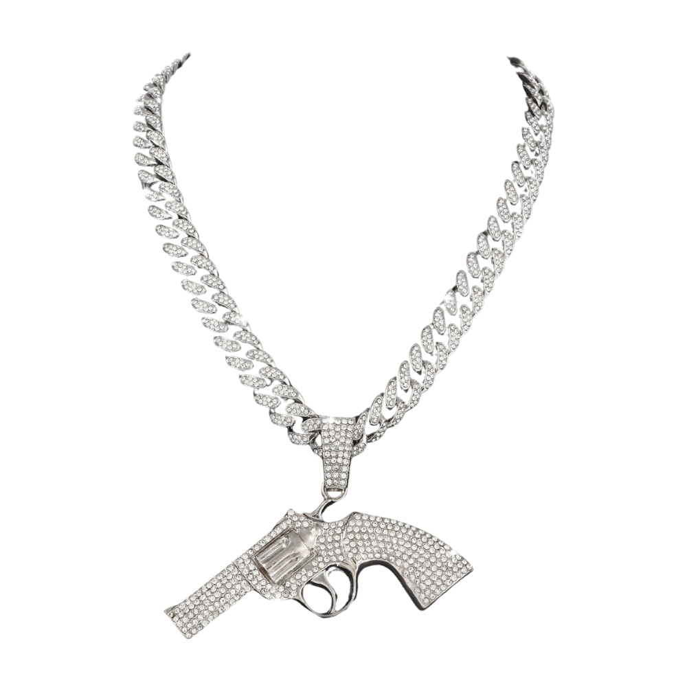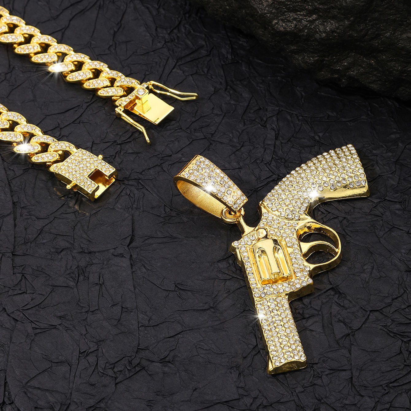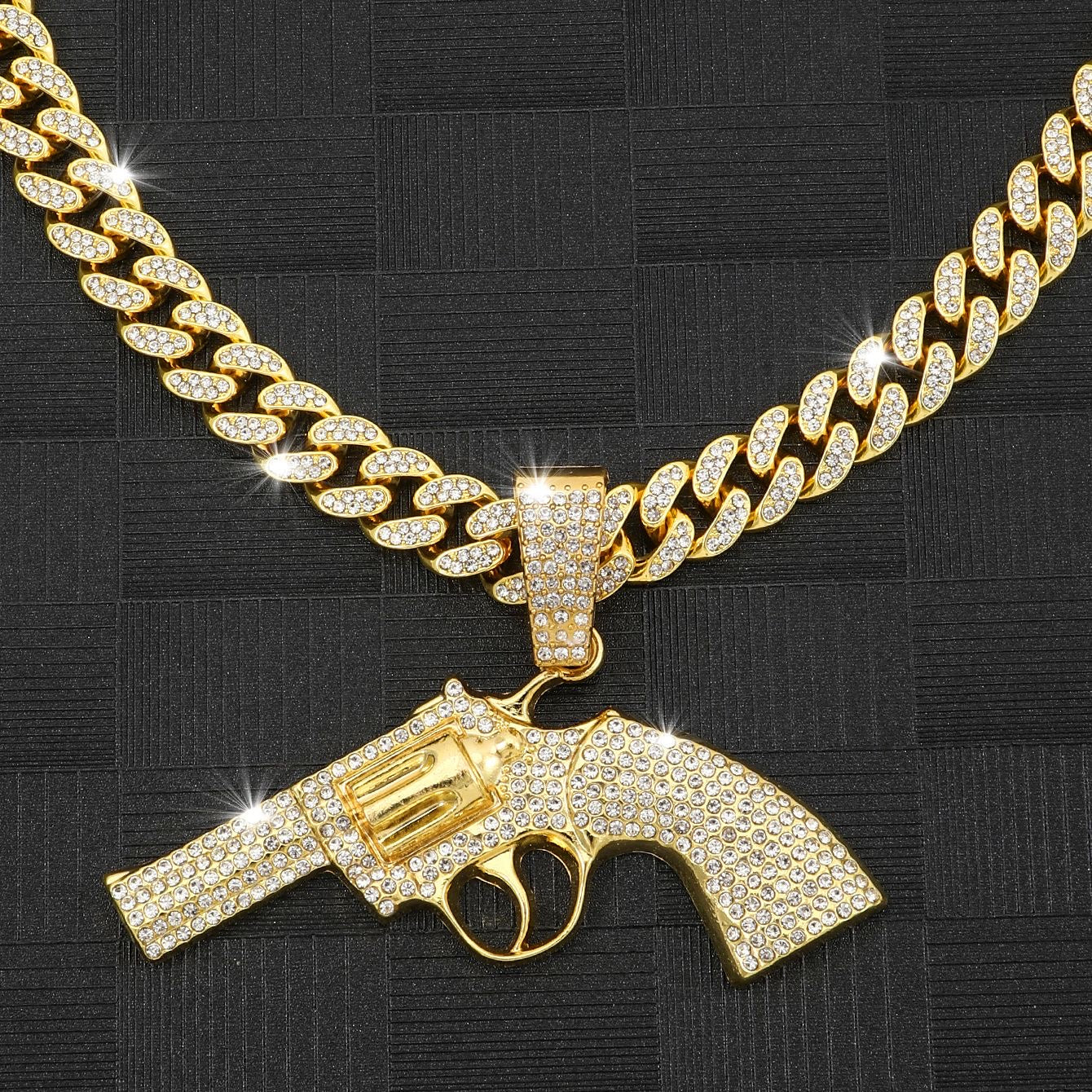 The iced-out revolver pendant packs heat in every sparkle, slung on a heavy gold Cuban link built to flex hard and loud.