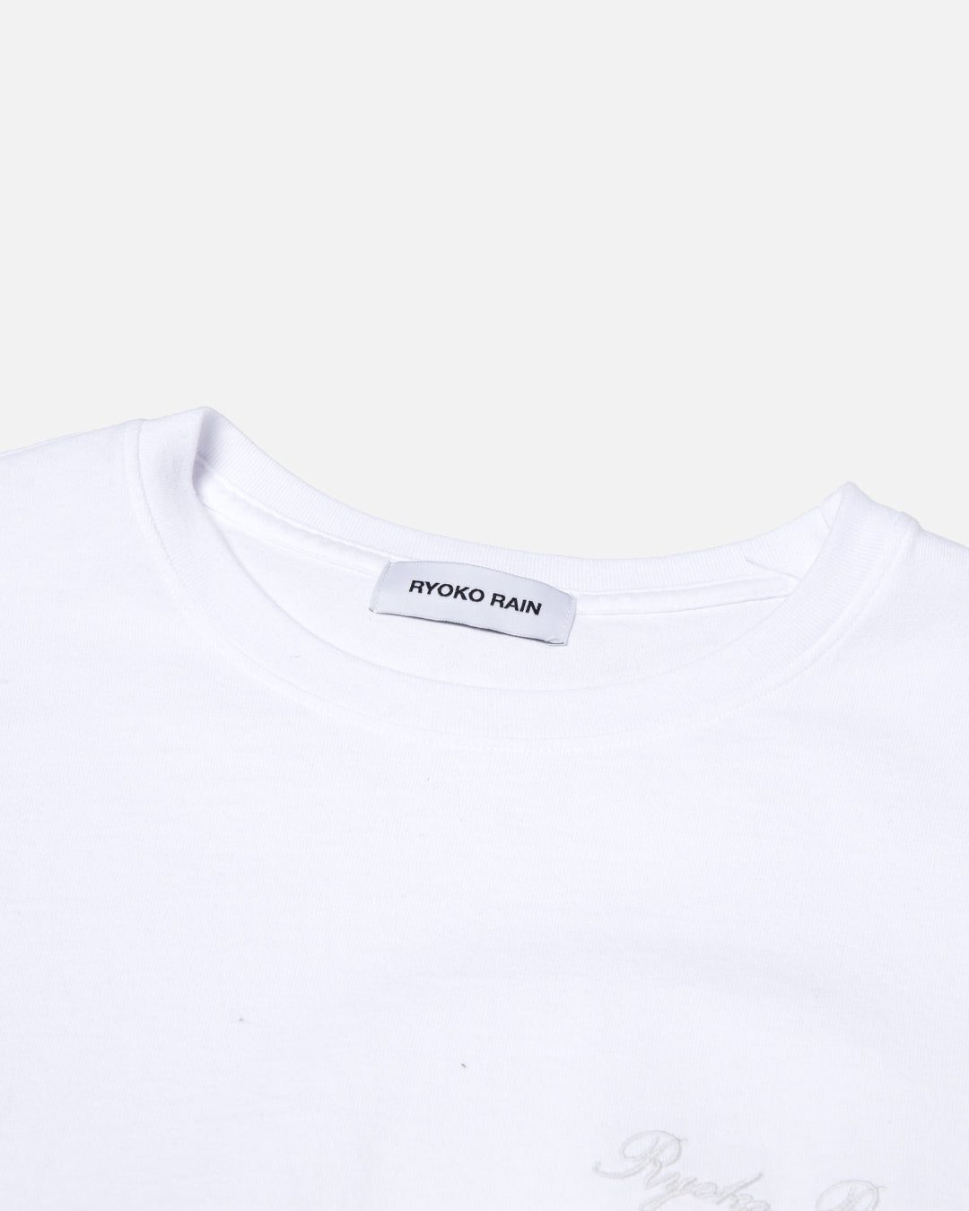 100% Cotton. Ryoko Rain white tee with left chest embroidery. Designed and finished in Orange County, CA. Produce in Los Angeles, CA.