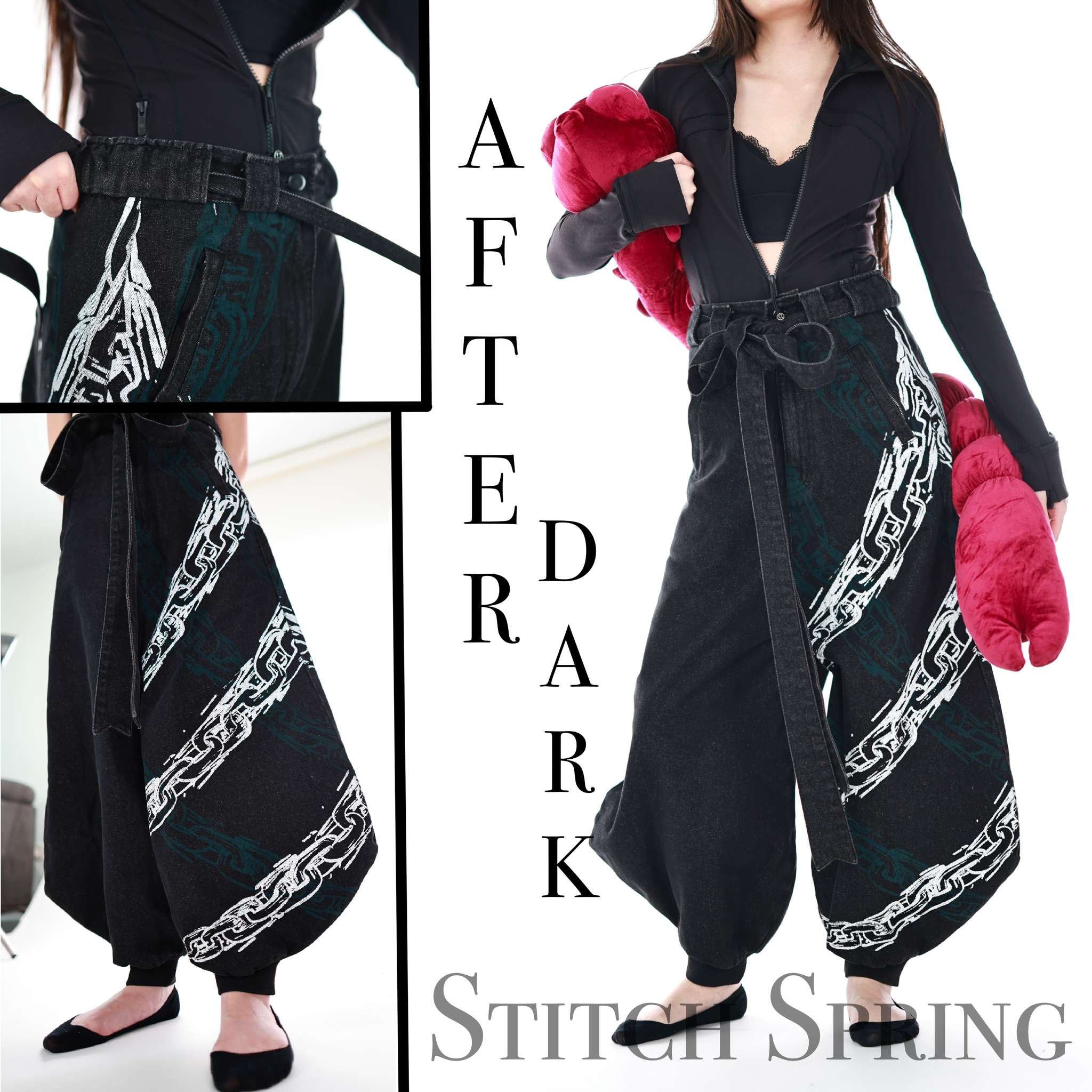 This whole collection features some of the most detailed embroidery, knit & print designs we have ever made. The fabric is made from a very high quality denim material. The chain print is very subtle and matches with the Chain T-Shirt and Sweater from the previous Cursed Collections. The chain patterns add a powerful touch. The design has the same shape as the pants T was wearing and is perfect to casually wear on the street. It is supposed to make you comfortable while standing out in a positive way. The pants also have pockets with Zippers in the front and elastic in the back for a comfortable fit.