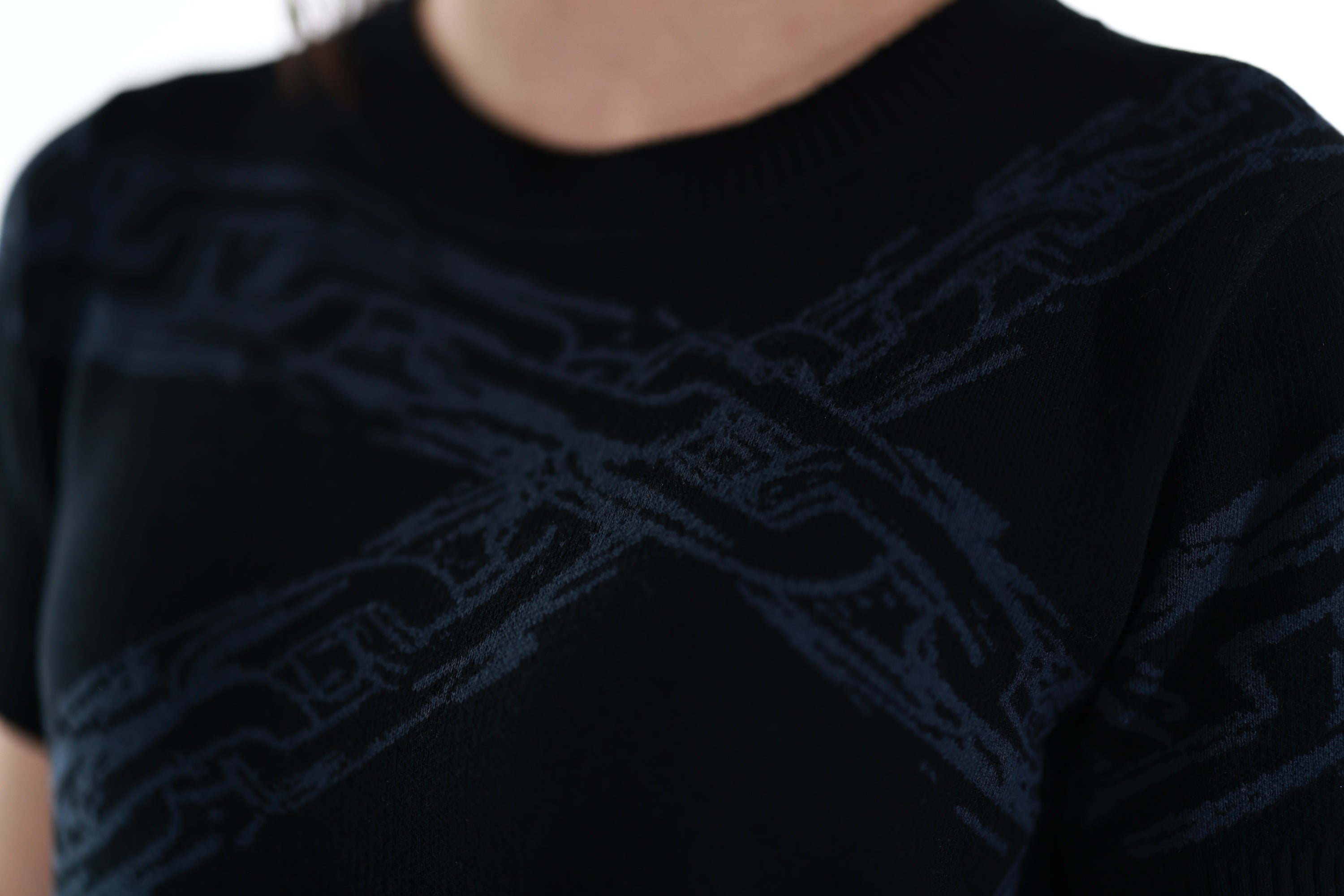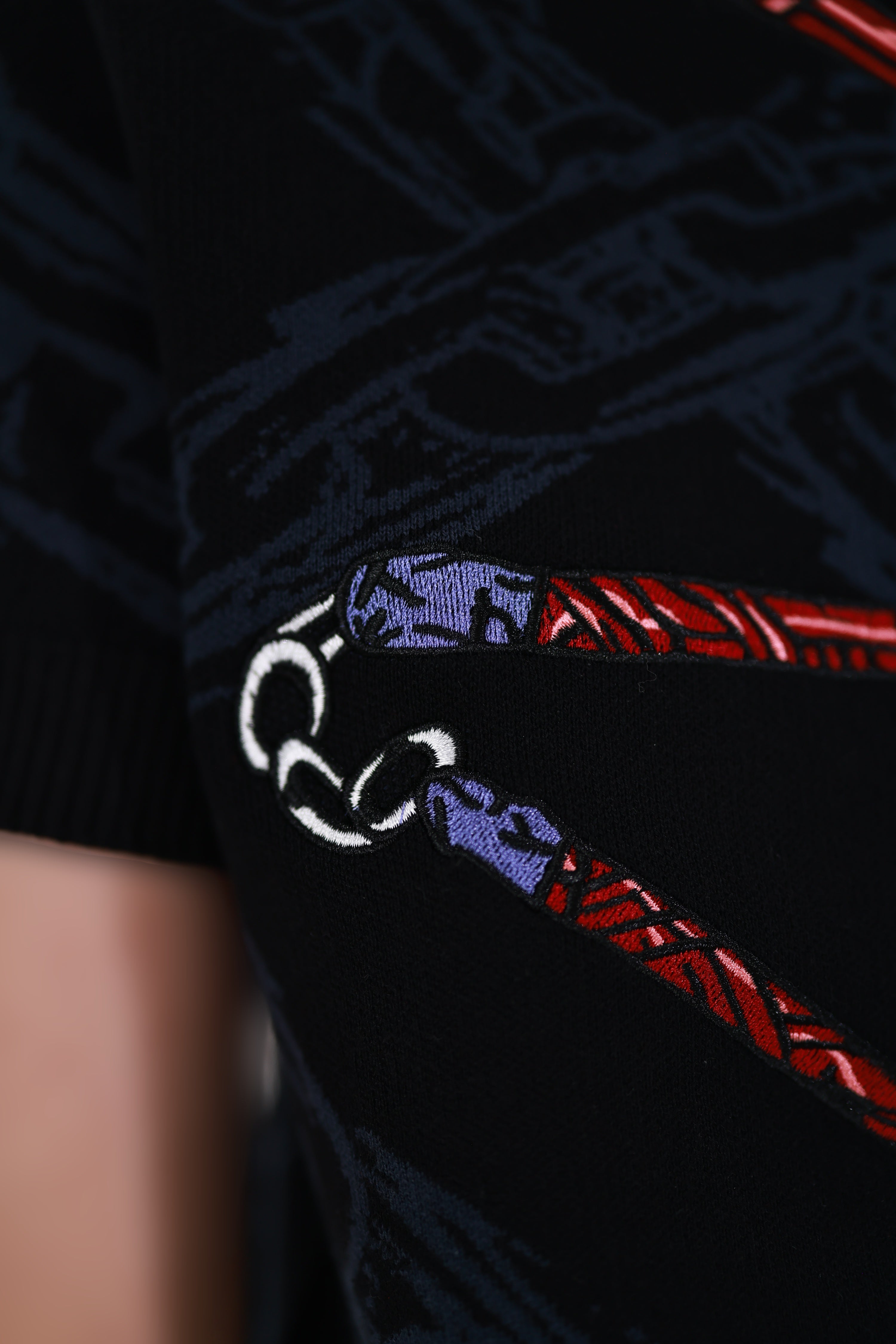 This whole collection features some of the most detailed embroidery & knit designs we have ever made. The fabric is made from jacquard knit and the highest quality 100% cotton yarns. Jacquard is a very high end manufacturing technique that retains color very well over time. The embroidery pattern of M's weapon adds a powerful touch inspired to the design. The design has the same shape as the T-Shirt TF was wearing and is perfect to casually wear on the street. It is supposed to make you comfortable while standing out in a positive way.