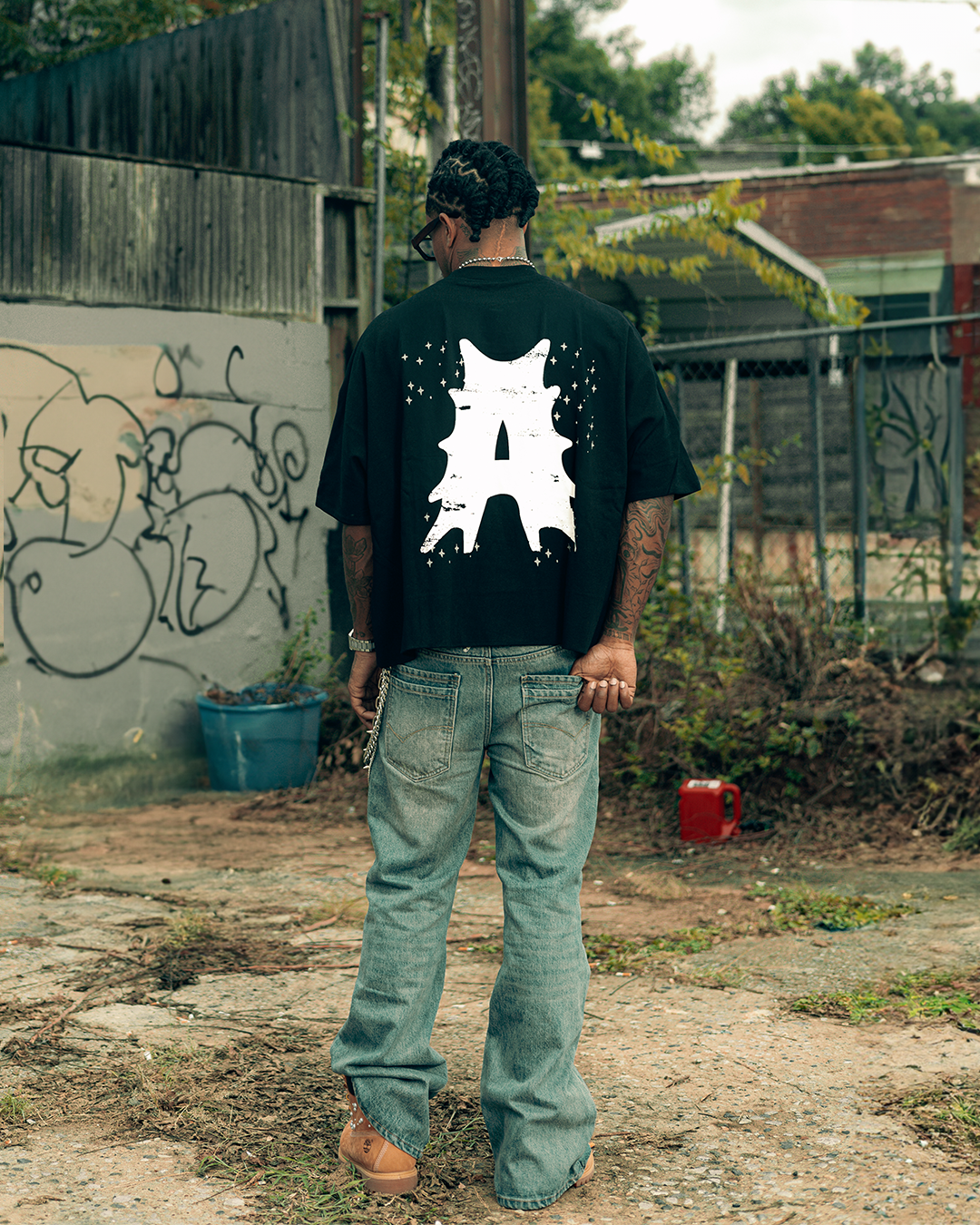 The stark black background contrasts sharply with the textured white text, making a bold statement of both loss and memory. Crafted with a boxy, oversized fit, this tee offers both comfort and a unique, individual character—perfect for those carrying cherished memories in their everyday journeys.
