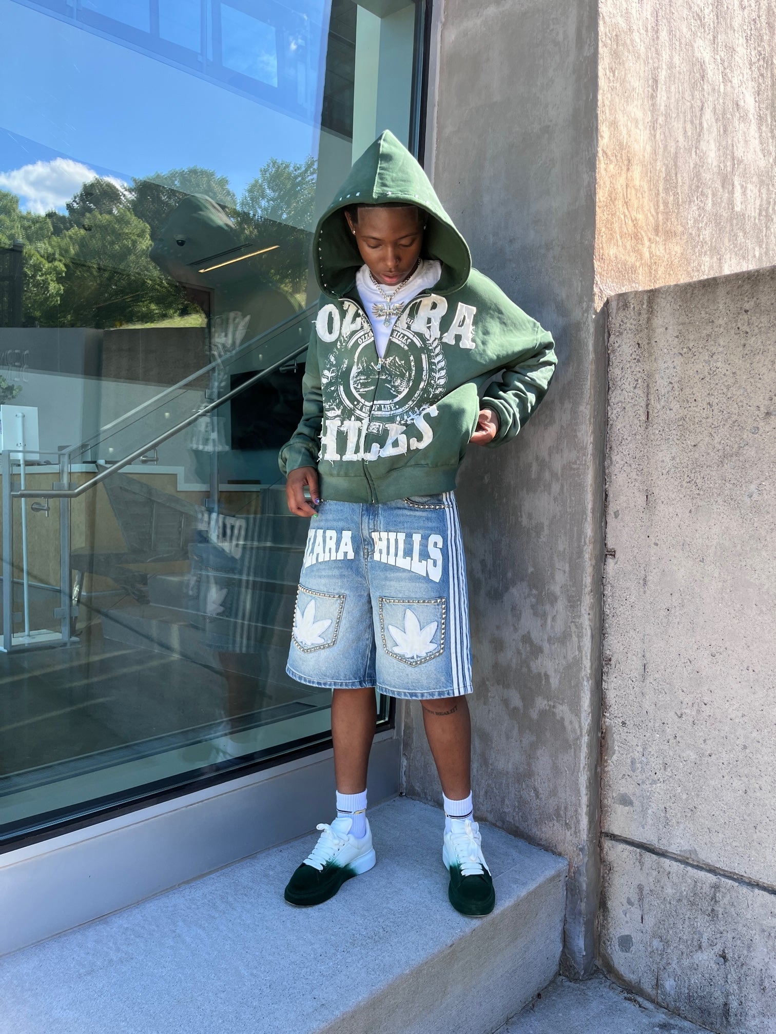 : Embroidered sleeve leaves and distressed "Ozara Hills" graphic.