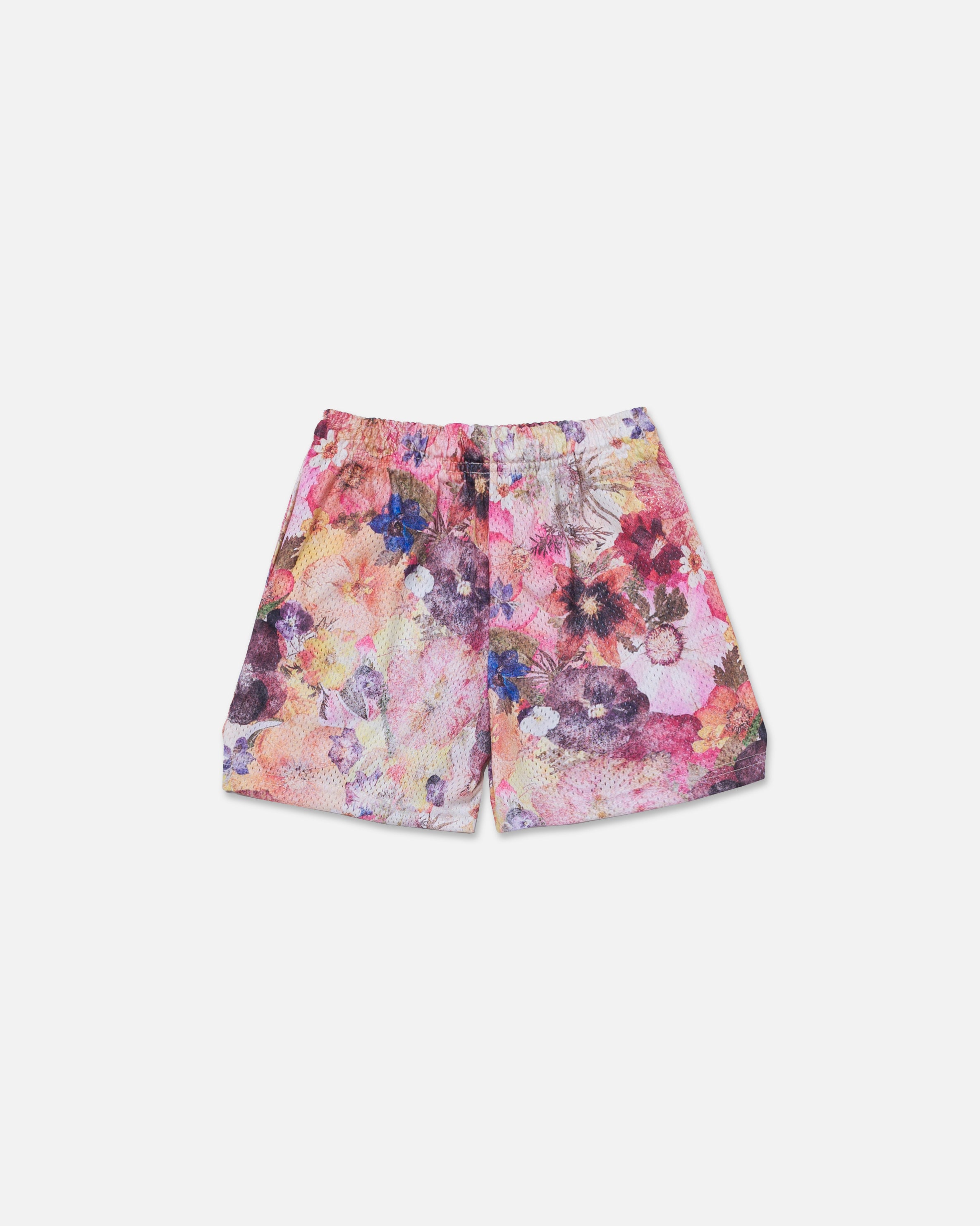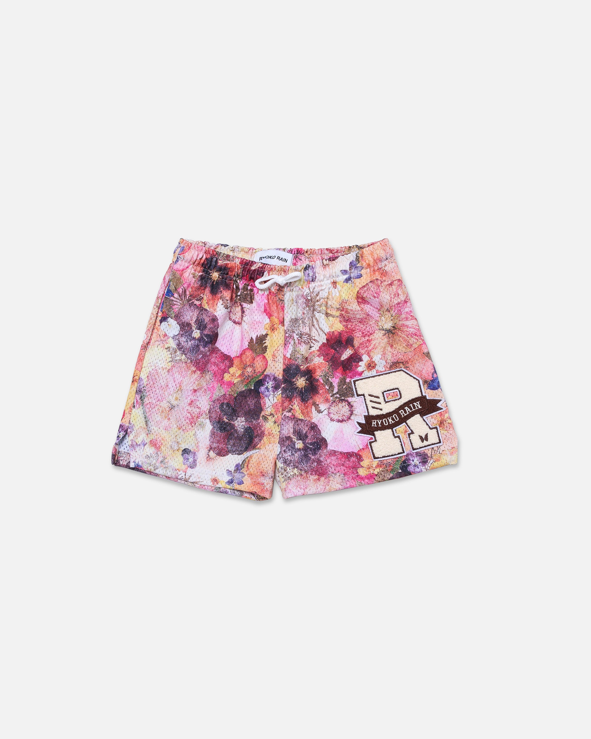 Ryoko Rain pressed floral pattern shorts with shades of pink, indigo, red and yellow. Featuring a left leg sewn ryoko rain patch. Elastic waistband w/ outer draw cord. Above the knee fit.
