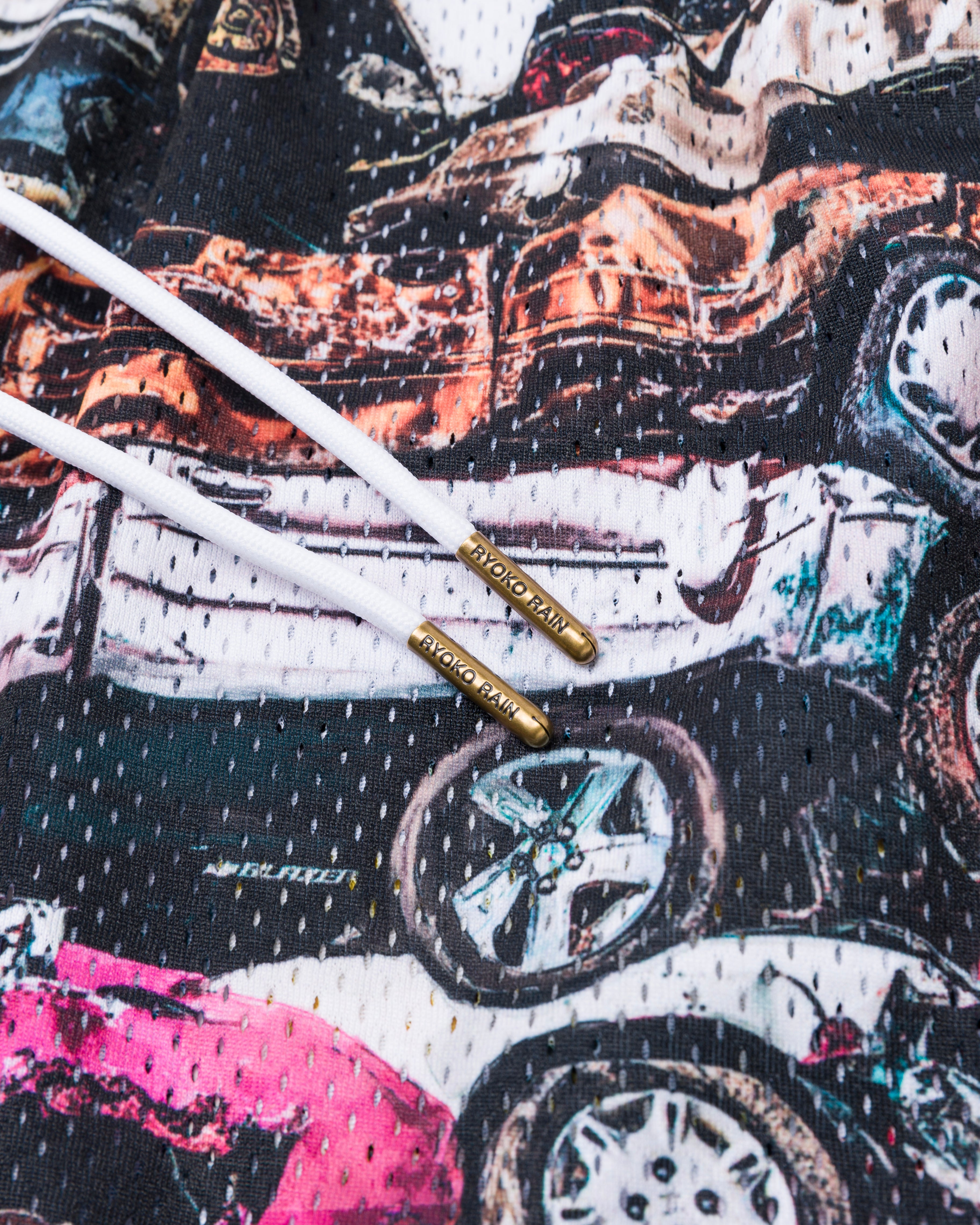 Ryoko Rain mesh shorts with a vintage stacked cars design. Deep pockets, elongated draw cord, and above the knee fit. Featuring a left leg woven patch.