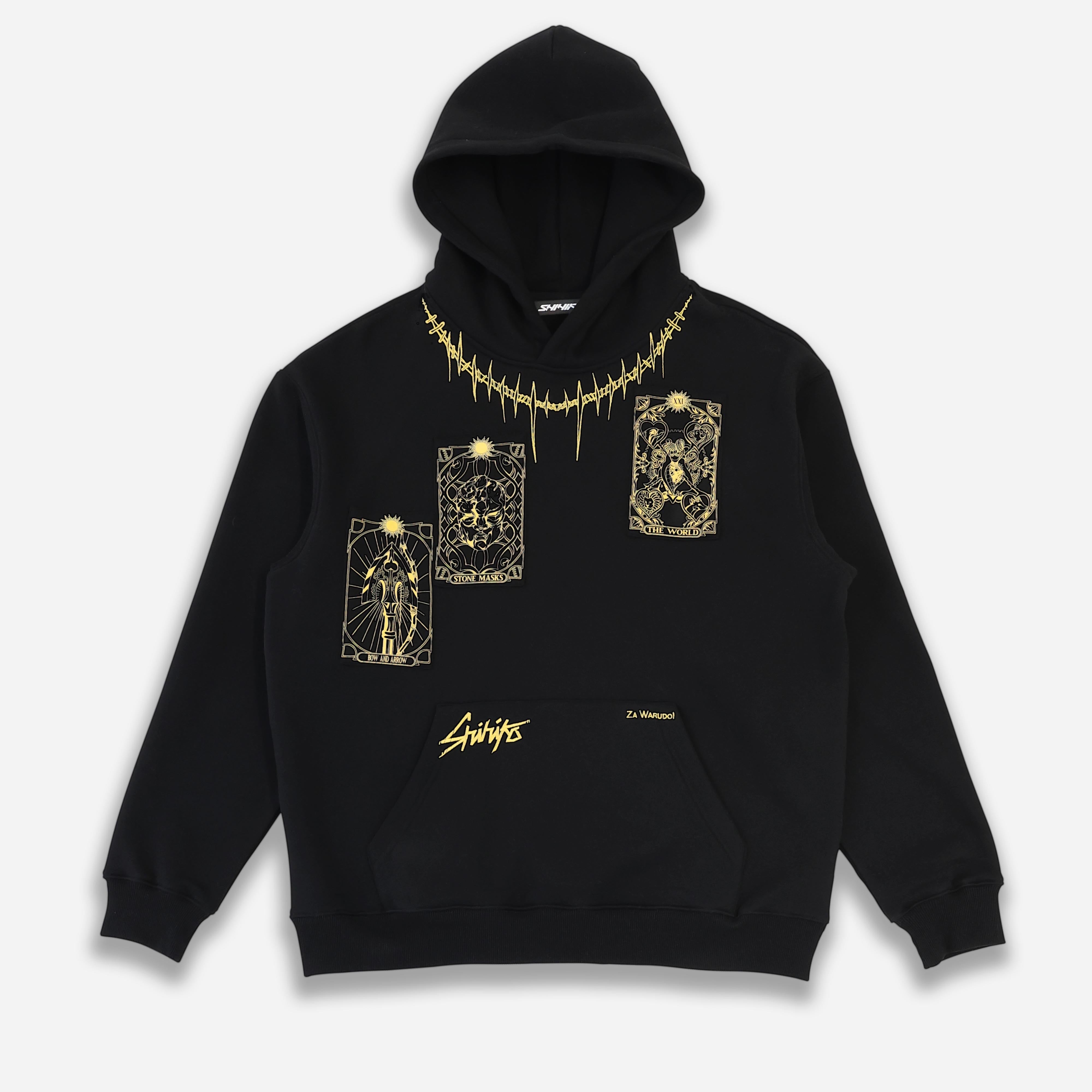 Za Warudo Hoodie in black is crafted from luxury heavyweight cotton, with a true-to-size fit and drop shoulders. It features embroidery patterns and 3 patches on the front. The hoodie has ribbed hems and cuffs and is finished with a Shihiko sleeve tag.